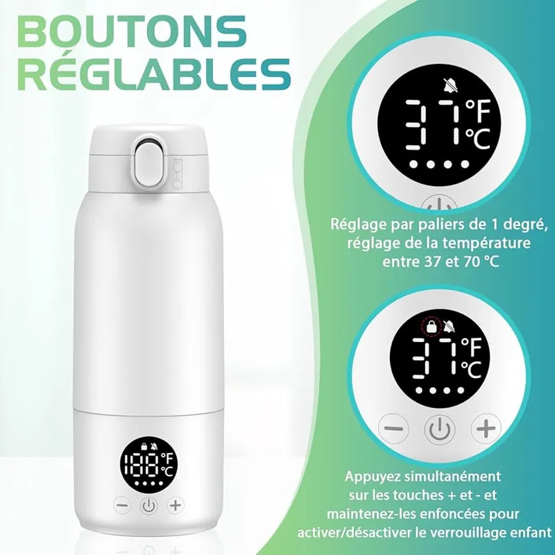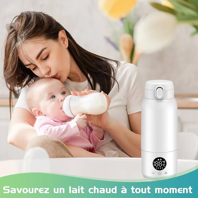 گرمکن شیشه شیر قابل حمل کودک در حال حرکت، شیشه شیر 500 میلی لیتری با عمر طولانی باتری 11000 میلی آمپر ساعت، دمای قابل تنظیم 35-70 درجه سانتیگراد، گرمکن سریع شیشه شیر کودک برای شیر مادر و آب