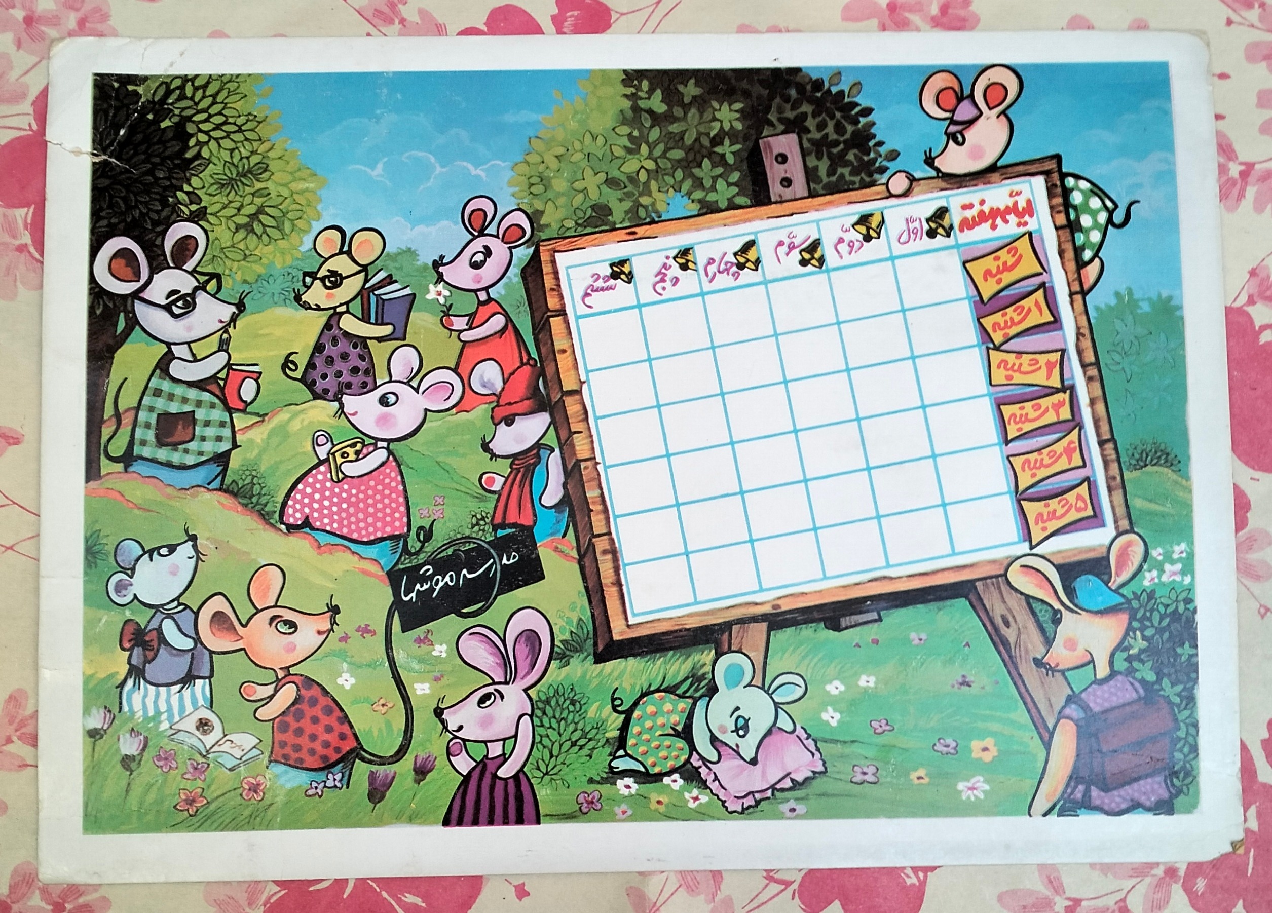 برنامه هفتگی مقوایی مدرسه موشها ، اصل و کلکسیونی ، آکبند قدیمی ، چاپ دهه 60 ، سایز بزرگ ، ته انباری ، مطابق عکسها