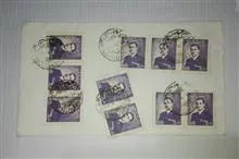 چندین تمبر که بر روی پاکت چسبانده شده. 18/4