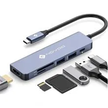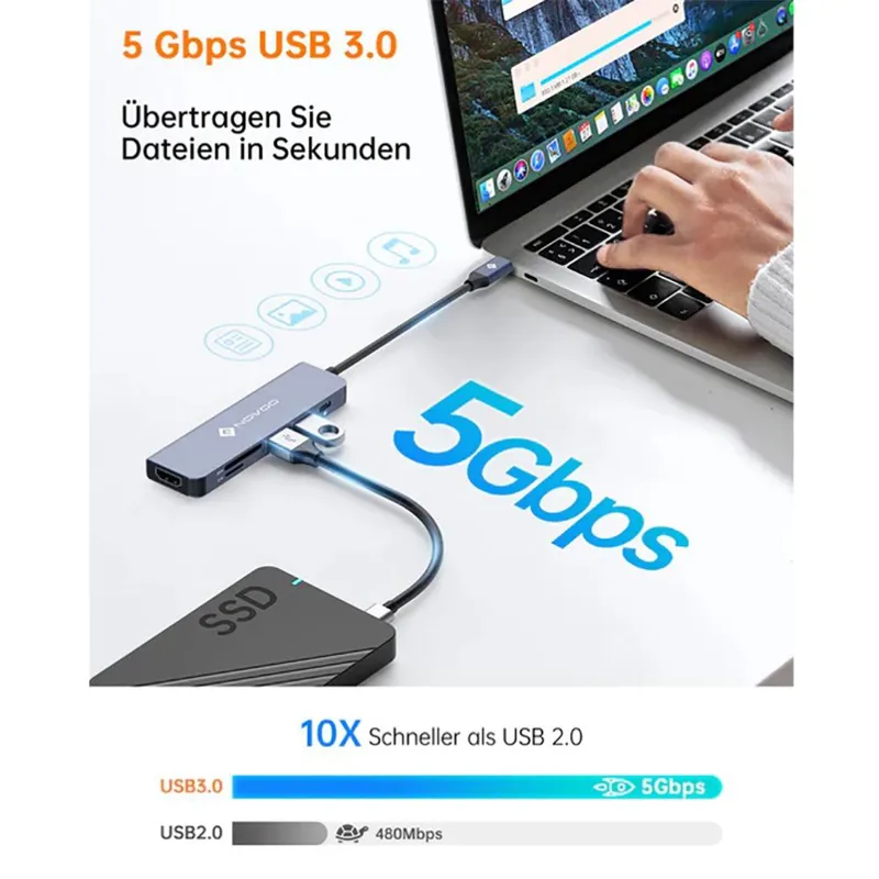 هاب NOVOO 6 در 1 هاب USB C هاب آداپتور USBC 2x USB 3.0 سرعت انتقال داده تا 5 گیگابیت در ثانیه. از انتقال فوق سریع انواع داده ها از دستگاه های USB به لپ تاپ های Type-C با امکانات کامل پشتیبانی می کند. می تواند همزمان 2 دستگاه USB-A مانند هارد دیسک، صفحه کلید،