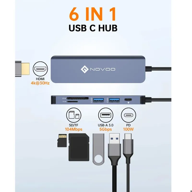 آداپتور USB C چند پورت USB C هاب NOVOO یک پورت Type-C را در لپ تاپ شما به 6 پورت با عملکردهای مختلف تبدیل می کند: HDMI 4K x1، USB 3.0 x 2، Type-C 100W PD پورت، اسلات کارت SD/ TF آداتور مک بوک USB C Hub برای کارهای اداری، جلسات، دفاتر خانگی کلاس، درس، بازی،