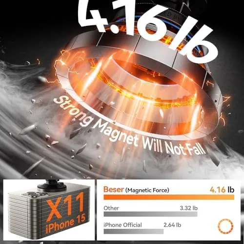 پایه نگهدارنده ماشین Beser 15W MagSafe، مغناطیس بزرگ (1.9 کیلوگرم)، شارژر بیسیم برای آیفون 16/15/14/13/12، شارژ سریع، امنیت، آلومینیوم، مشکی