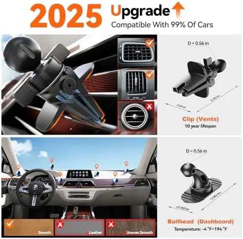 سازگاری با خودرو: مناسب برای 99٪ خودروها، قابل استفاده روی دریچههای هوا یا داشبورد (تصویر 2 را ببینید)؛ قلاب مغناطیسی نگهدارنده گوشی ماشین نسل هفتم دارای فرآیند قالبگیری ثبت شده است، از خراشیدگی تیغه جلوگیری میکند. قلاب کشیده 49 میلیمتری 99٪ دریچهها را پوشش میدهد و سازگاری را 63٪ افزایش میدهد. شامل یک پایه نگهدارنده قوی (3M) برای داشبورد است.
