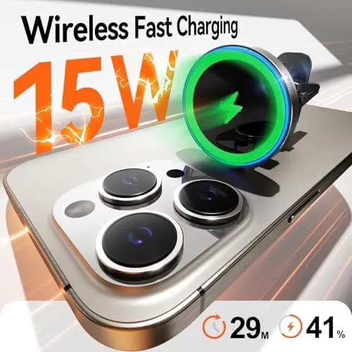 شارژ سریع و ایمن 15 واتی: برای پایه نگهدارنده خودرو magsafe از یک تراشه هوشمند BeserQI برای شارژ سریع 15 واتی-فوق العاده استفاده میکند و باتری را تنها در 39 دقیقه 41٪ شارژ میکند. با شارژر خودرو QC3.0/PD (که شامل نمیشود) بهترین عملکرد را دارد.