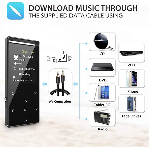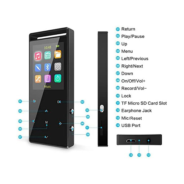 (پخشکننده MP3 بدون افت کیفیت 32 گیگابایتی): پخشکننده MP3 از کارت حافظه میکرو SD 128 گیگابایتی پشتیبانی میکند، میتوانید از این پخشکننده MP3 به عنوان فلش مموری برای ضبط بسیاری از فایلها یا موسیقی استفاده کنید. از فرمتهای موسیقی مختلف مانند MP3، WMA، APE، FLAC، WAV و غیره پشتیبانی میکند.
