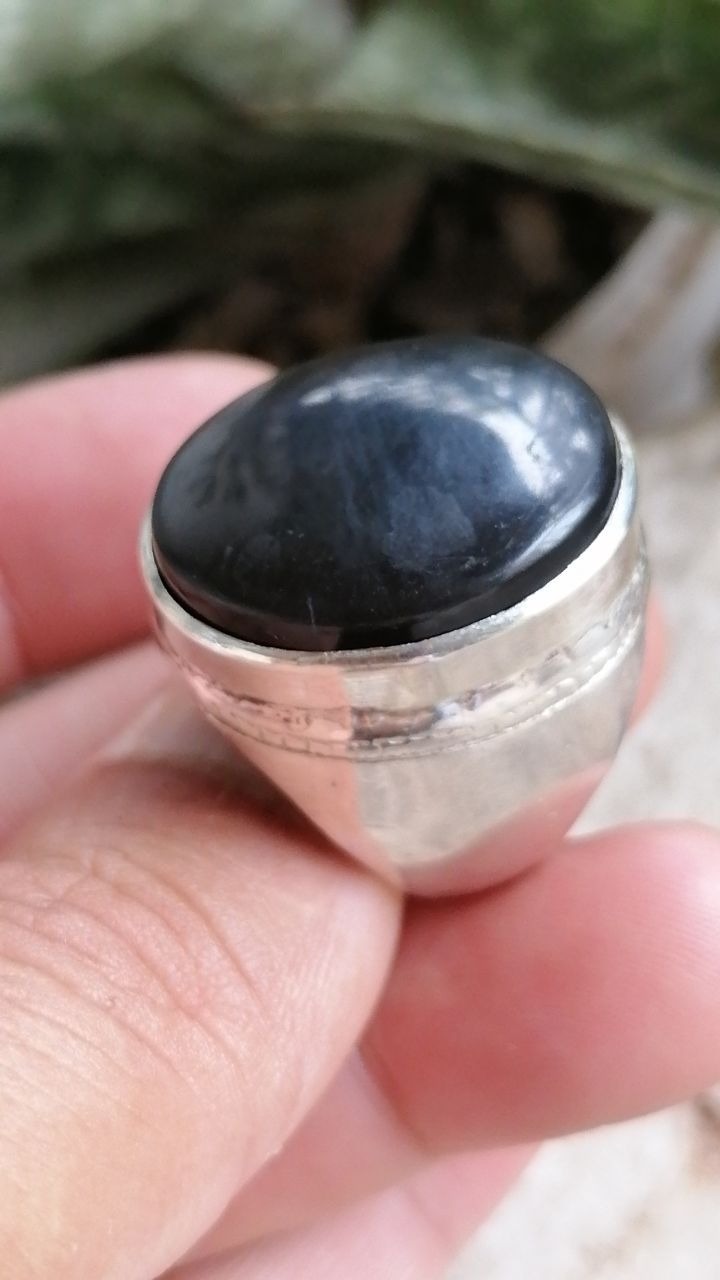 انگشتر نقره ظاهرا به شفت العبد میخوره اما نوعی سنگ ردونیت مشکی با انرژی بالا کاملا کهنه در قدیم از این سنگ برای انرژی وقدرت استفاده میکردند دستساز قدیم سایز 67 تا68 وزن بالای 17 گرم ابعاد 2.5در2 سانت داخل سنگ هم از زیر سنگ هم روی سنگ واضح عکس گرفتم مصور