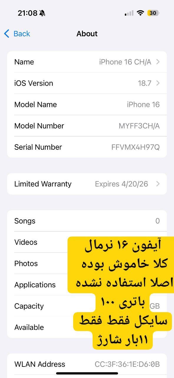 آیفون 16 نرمال حافضه 128 گیگابایت پارت نامبر CHA دوسیم کارت