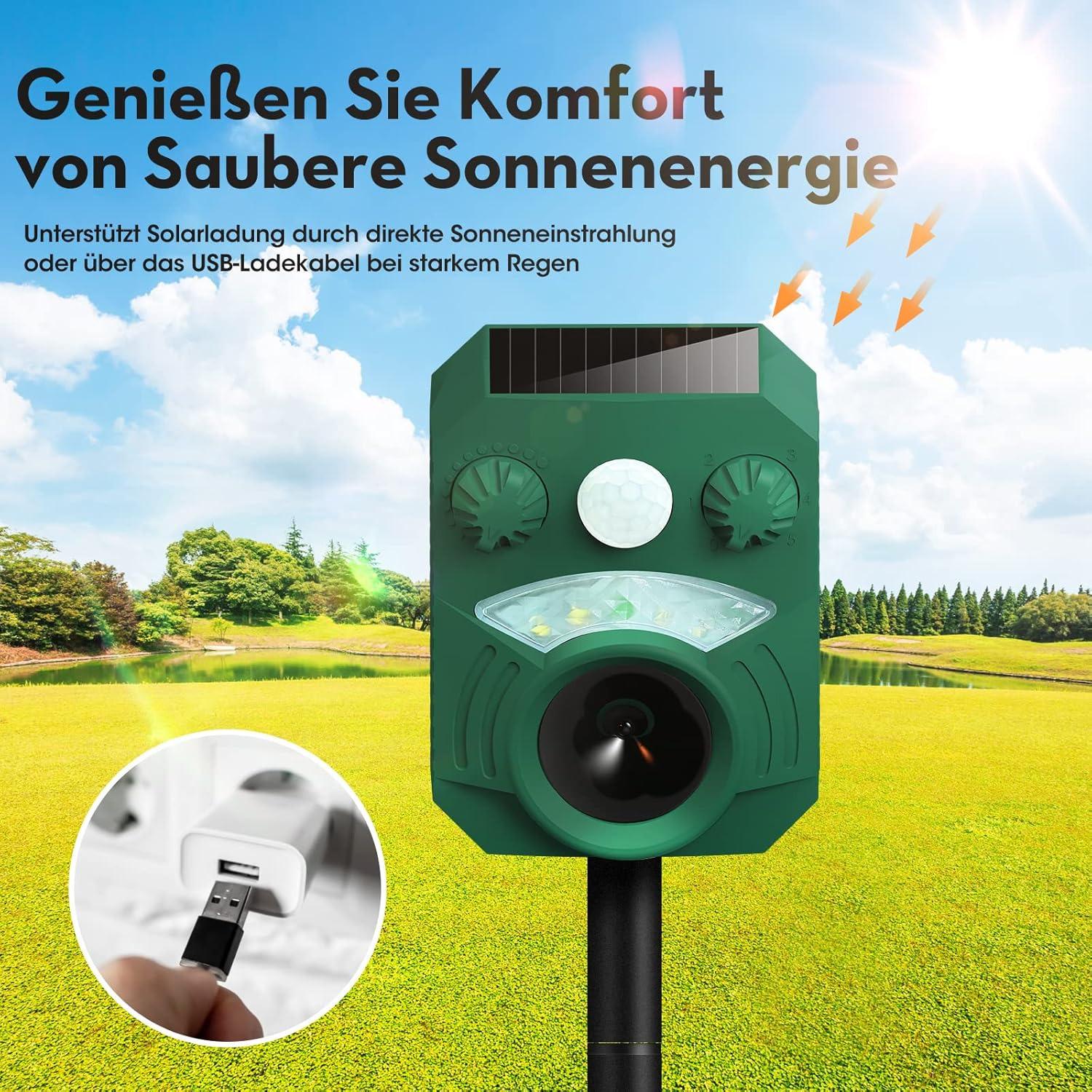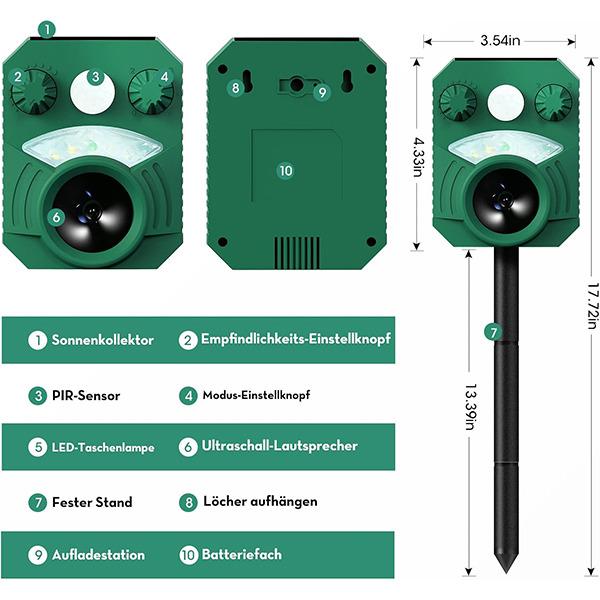 - دفع کننده حیوانات با امواج فراصوت خورشیدی، دفع کننده گربه، دفع کننده سمور آبی، برد تا 10 متر، سنسور حرکت، فرکانس 13.5-45.0 کیلوهرتز، موثر در برابر گربه ها، سگ ها، پرندگان، روباه ها، موش ها، سمور آبی