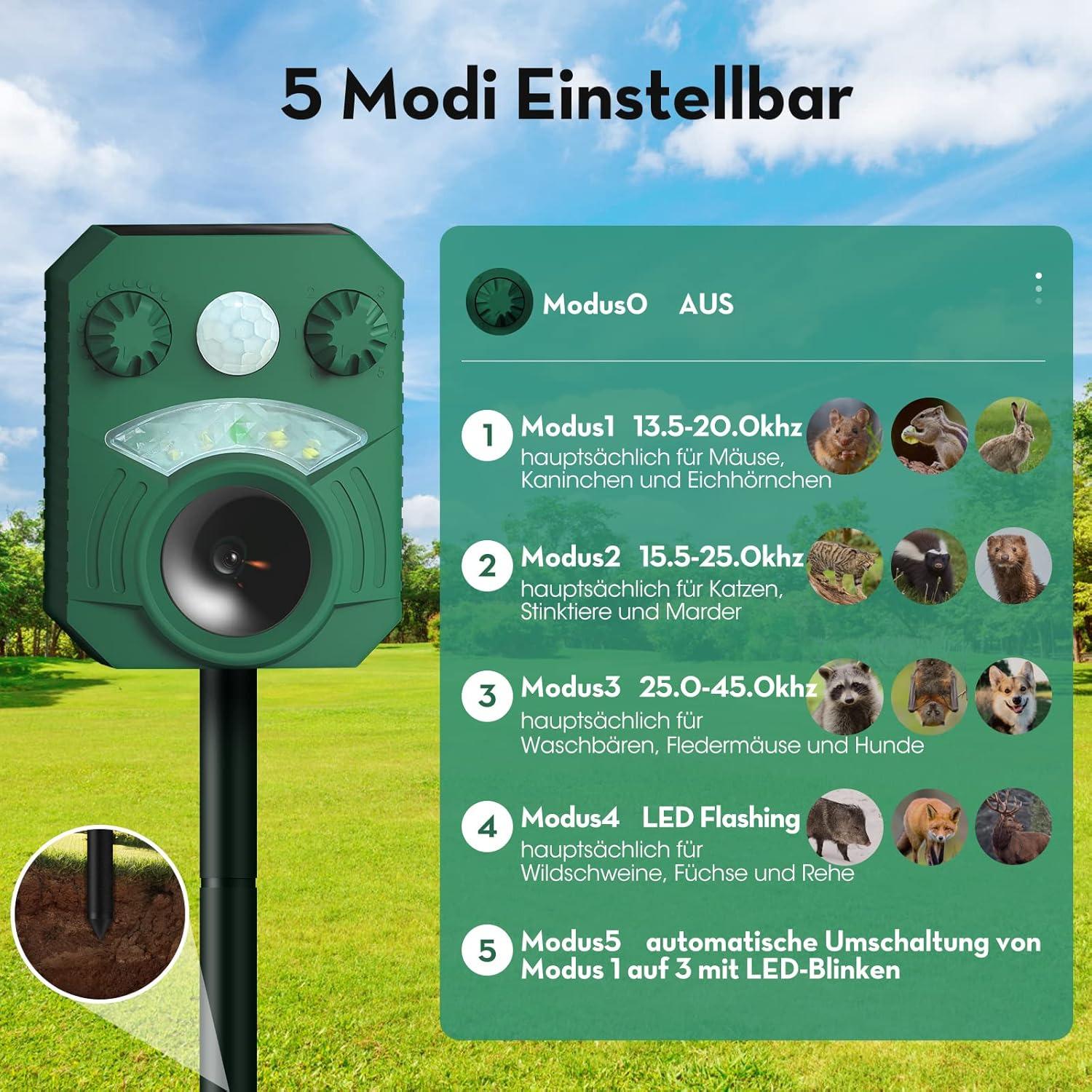 (5 حالت قابل تنظیم)" این دافع با 5 حالت توسعه داده شده است: حالت (دستگاه خاموش است)؛ حالت 1 (اولتراسوند از 13.5 تا 20 کیلوهرتز)؛ حالت 2 (اولتراسوند از 15.5 تا 25 کیلوهرتز)؛ حالت 3 (اولتراسوند 25-45 کیلوهرتز)؛ حالت 4 (LED چشمکزن)؛ حالت 5 (تغییر خودکار از 1