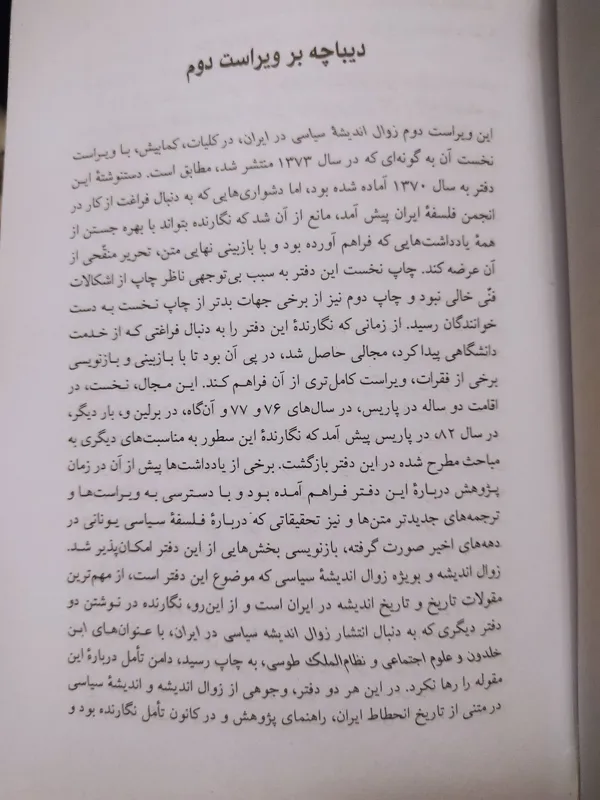 او با اتخاذ یک رویکرد هگلی به این سوال پاسخ میدهد که خوانشی فلسفی از تاریخ را با این فرض که اندیشه فلسفی اساس و جوهر هر جامعه سیاسی و مبنای هر تحلیل انتقادی از آن است، امتیاز میدهد. این کتاب به طور انتقادی اندیشههای "جواد طباطبایی" را درباره بحران و انحطاط از طریق به چالش کشیدن شرح او از سنت ایرانی، اظهار میکند.
