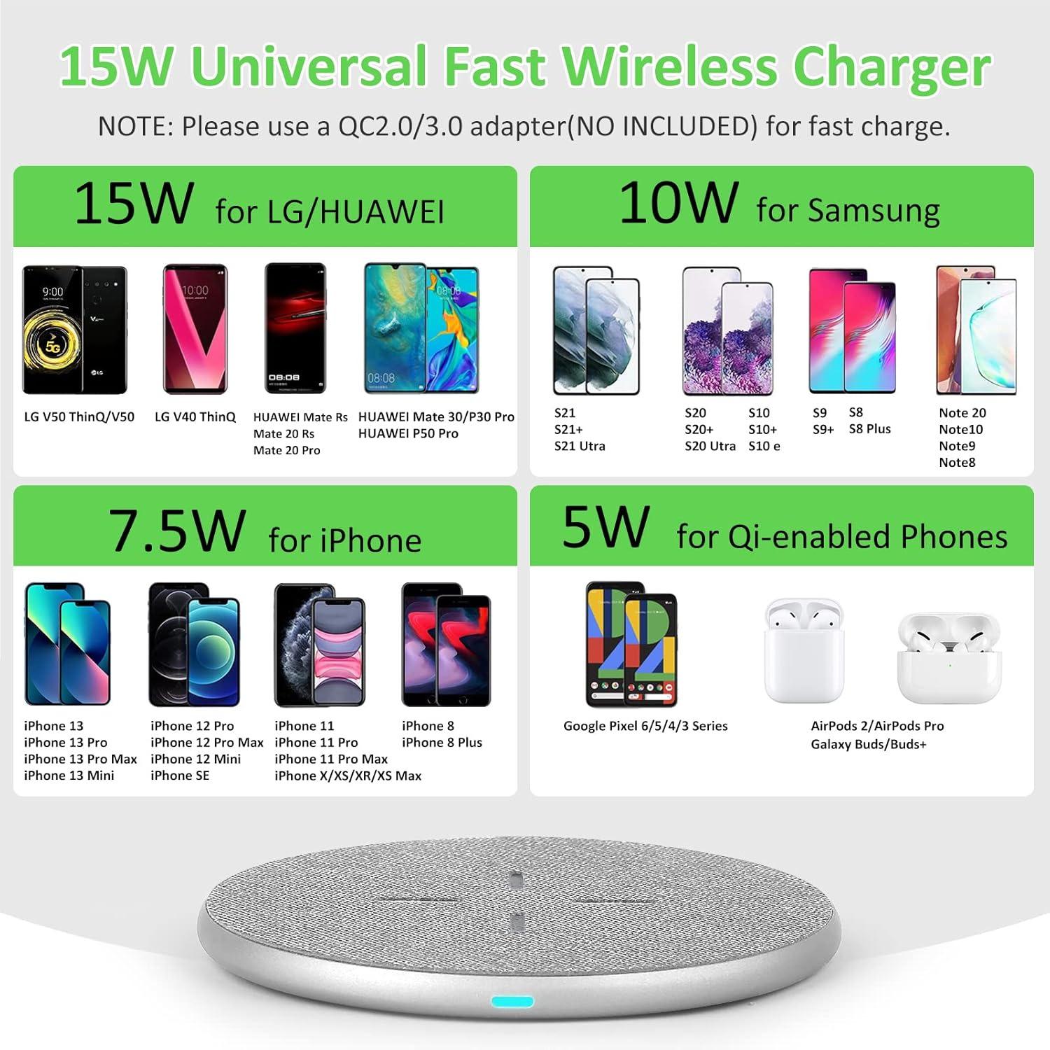 - شارژر بیسیم Evershop برای آیفون 14/13 پرو مکس/12/11/ایکس اس مکس/ایکس آر/ایکس/8 پلاس/8. پد شارژ سریع 15 واتی برای سامسونگ گلکسی S22/S21/S20/S10/S9/S8/S7، نوت 9/8/هواوی P30 پرو، ایرپاد 5 واتی برای همه گوشیهای دارای فناوری Qi