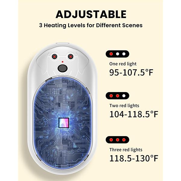 - (3 سطح گرمایش، 5-20 ساعت زمان کار): گرمکن دست قابل شارژ ما سه سطح دما ارائه میدهد. در دمای محیط 68 درجه فارنهایت، سطح گرمایش اول میتواند 20 ساعت، سطح گرمایش دوم میتواند 14 ساعت و سطح گرمایش سوم میتواند 8.5 ساعت کار کند. در دمای 5 درجه فارنهایت، سطح اول میتواند 8.5 ساعت، سطح دوم 7.5 ساعت و سطح گرمایش سوم 5 ساعت کار کنند.