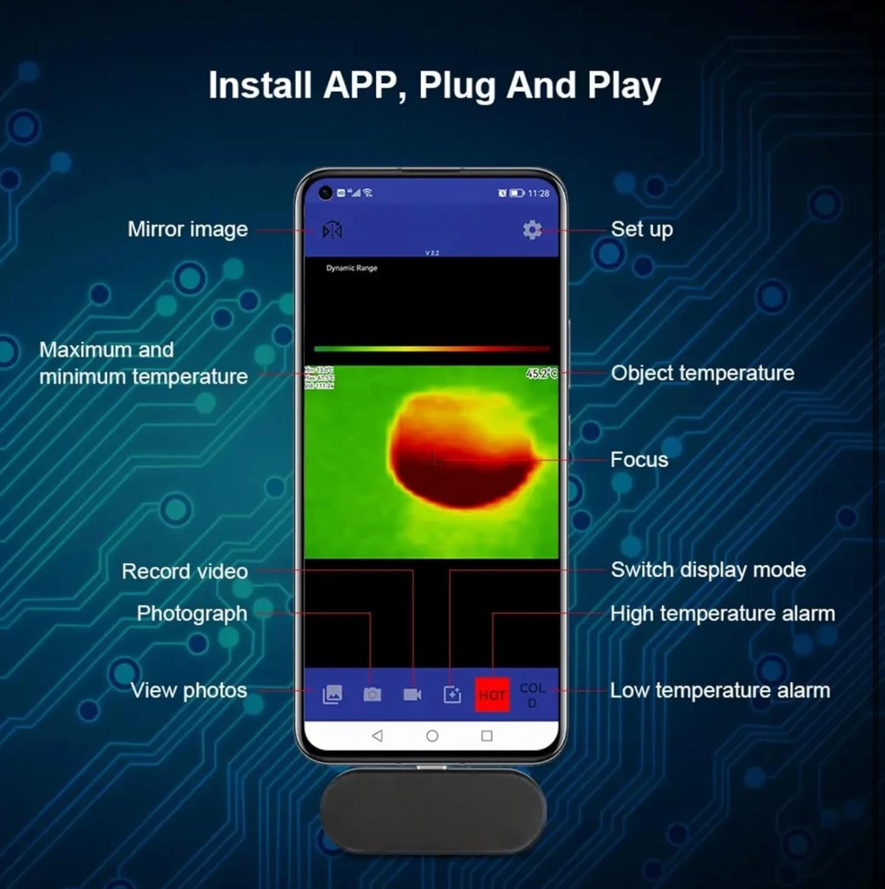 سازگاری بینقص و عملکرد آسان: دوربین تصویربرداری حرارتی تلفن همراه از طریق درگاه Type-C با دستگاههای اندروید سازگار است. برای راهاندازی سریع، کافیست نرمافزار "Thermal Viewer" را دانلود کنید. کنترلهای شهودی، عملکرد بدون نگرانی را تضمین میکنند.