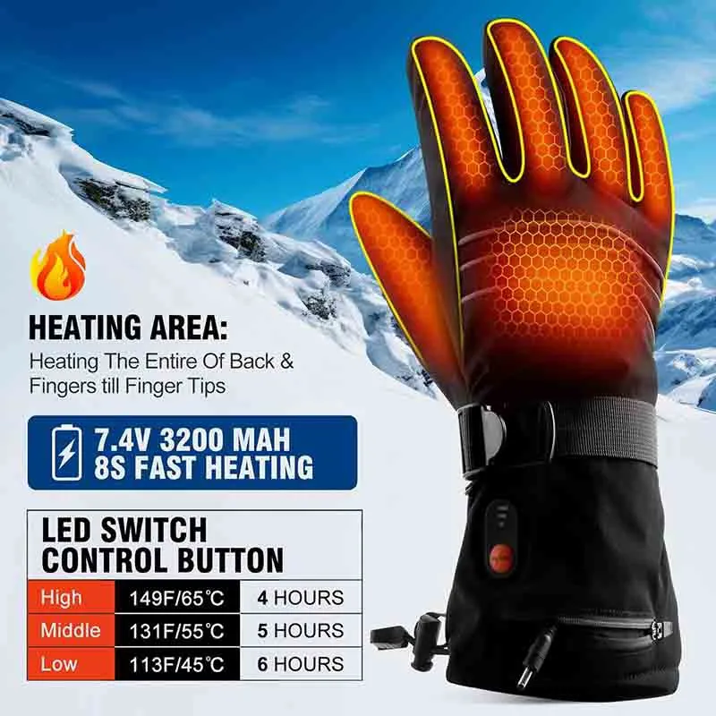 سیستم گرمایش سریع: دستکش های گرم می شوند ABXMAS تمام پشت دست و انگشتان را می پوشانند، به سرعت در 8 گرم می شوند تا دستان شما گرم شود، باتری لیتیوم یون 7.4 ولت 6400 میلی آمپر ساعت، می تواند به مدت 6 ساعت در دماهای پایین به طور مداوم استفاده شود.