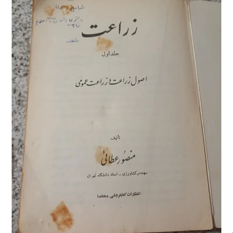 فقط 7 صفحه از کتاب لکه های پراکنده قهوه ای رنگی ایجاد شده و یا صفحه اول کتاب با خودکار اندکی نوشته شده است. که تصویر نمونه گذاشته ام.