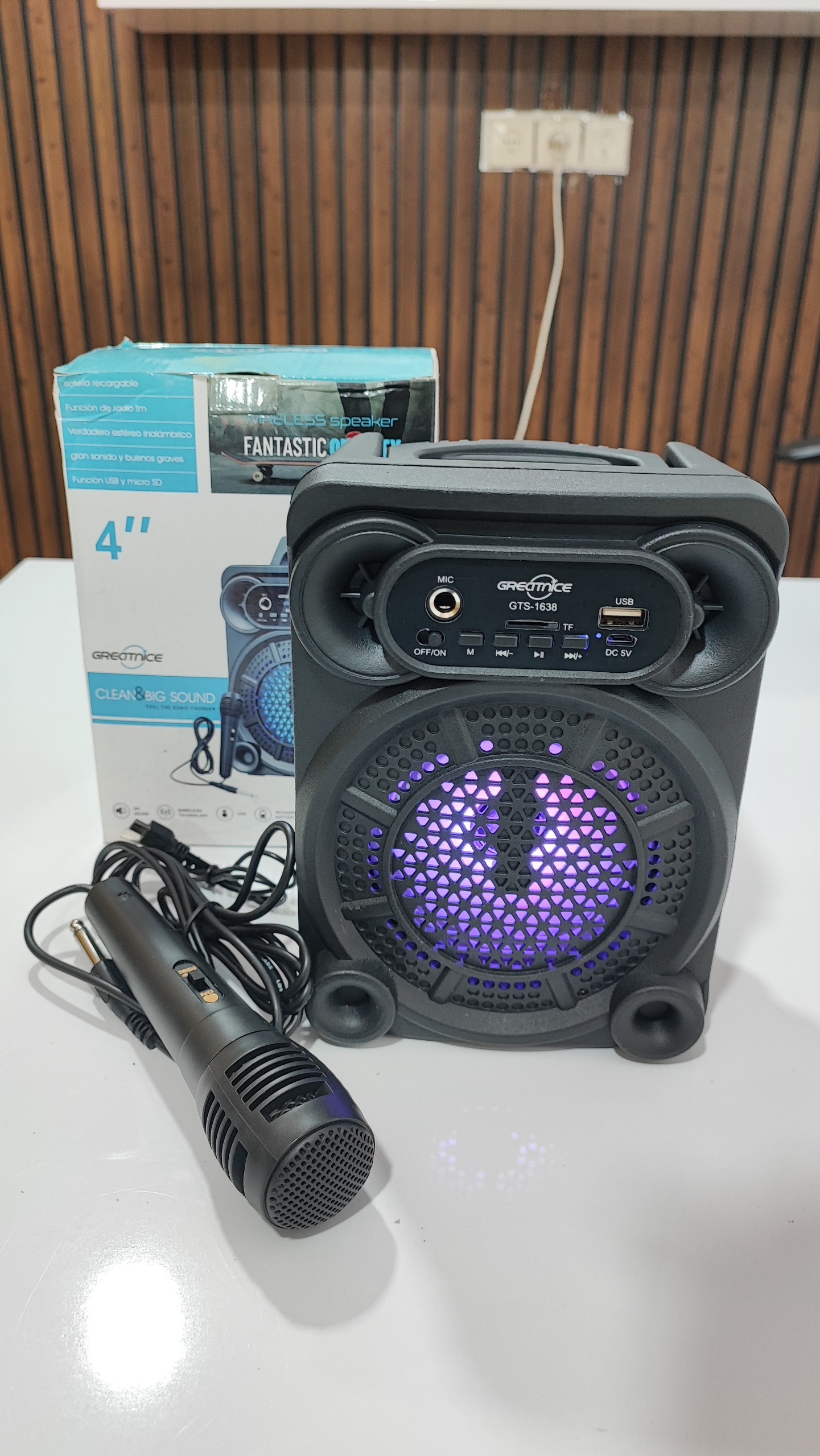 اسپیکر مدل GTS-1638 یکی از محصولات اقتصادی برند گریت نایس چین است که دارای 1 عدد بلندگو 4 اینیچ است که قدرت پخش صدا تا 15 وات را دارد و از قابلیت های عمومی محصولات دیگر این شرکت مانند رقص نور و اتصال به بلوتوث بهرهمند می باشد.علاوه بر ویژگی های پایه این اسپیکر قابلیت اتصال میکروفون را برای پخش صدا دارد و می تواند گزینه خوبی برای تمرین خوانندگی و پخش صدای اشخاص در محیط های کوچک باشد .