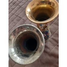 یک جفت گلدان میناکاری داخل یکی ازگلدان ها دراثرمرور زمان رنگ یکیشون رفته شده وداخل رنگش عوض شده ولی ظاهرشون سالمه