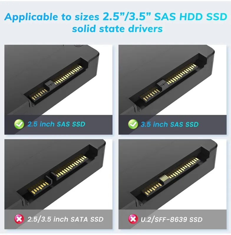 [سازگاری گسترده] - - ریدر SAS با تمام برندهای هارد دیسک سرور سازمانی SAS 2.5 اینچی یا 3.5 اینچی / درایو حالت جامد (هارد دیسک سرور/اس اس دی)، هارد دیسک/اس اس دی SATA در 10/8/7/XP، سیستم عامل مک، لینوکس سازگار است. برای PCIe NVMe (U.2)/SFF-8639 مناسب نیست. ظرفیت پشتیبانی تا 12 ترابایت