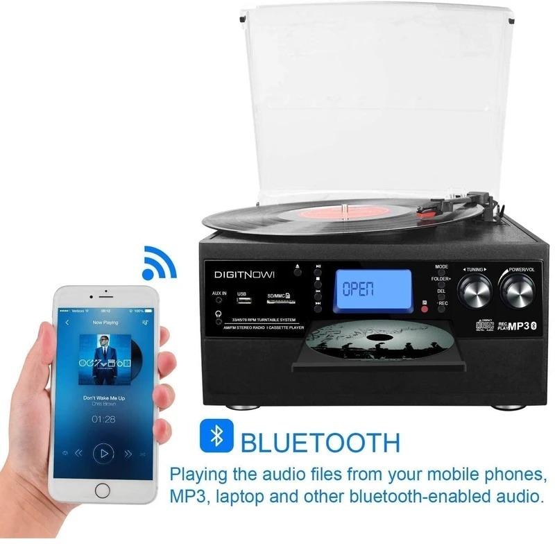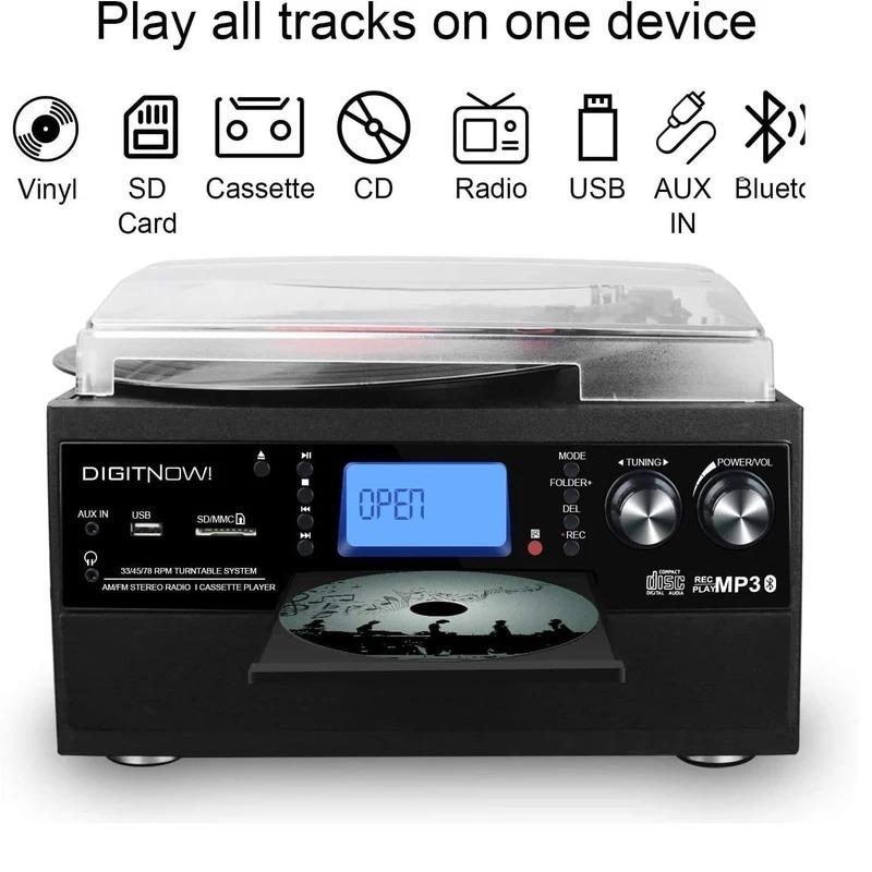 گرامافون پخش کننده بلوتوث DIGITNOW با بلندگوی استریو، تبدیل وینیل LP به MP3 با CD، کاست، رادیو، ورودی AUX و رمزگذاری USB/SD، کنترل از راه دور، پخش کننده موسیقی صوتی با آمپلی فایر داخلی 3 سرعت قابل انتخاب - تنظیمات سرعت 33/45/78 دور در دقیقه به همراه آداپتور 45 دور در دقیقه. پخشکنندهی صفحه گرامافون بلوتوث برای صفحات وینیل با قابلیت حذف و حرکت سریع به جلو، ضبط و حذف. پخش رادیو استریوی آنالوگ AM/FM و تبدیل به MP3. ورودی Aux برای اتصال دستگاههای دیگر (سیدی، آیپاد، آیفون و غیره) پشتیبانی مستقیم از USB/SD برای صفحه گردان، بلندگوی استریو داخلی، صفحه نمایش LCD با نور پس زمینه، دارای کاور ضد گرد و غبار پخش کننده همه کاره ضبط صدا پخشکنندهی همهکاره، صدای فوقالعادهای ارائه میدهد که میتواند تمام نیازهای شما را برآورده کند. با قابلیت بلوتوث، پخشکنندهی سیدی و نوار کاست، بلندگوی استریوی داخلی و قابلیت ضبط روی دیسک USB/کارت SD. به راحتی موسیقی را در هر جنبهای از زندگی خود - از روی میز تا کنار تخت، از صبحهای آفتابی تا شبهای بارانی - ادغام کنید. عملکرد بلوتوث گیرنده بلوتوث داخلی به شما امکان میدهد موسیقی خود را به صورت بیسیم به بلندگوهای استریوی گرامافون DIGITNOW! منتقل کنید، بنابراین میتوانید فایلهای صوتی را از تلفنهای همراه، MP3، لپ تاپ و سایر دستگاههای صوتی دارای بلوتوث خود پخش کنید. این ویژگی، این دستگاه را به انتخابی جذاب برای کسانی تبدیل میکند که از موسیقی با حس گشت و گذار در هر مکانی لذت میبرند. بلندگوی استریو سیستم استریوی فعال و داخلی، صدای بلند و واضحی را ارائه میدهد. کنترل از راه دور دستی و کامل نیز در این دستگاه گنجانده شده است که میتواند بهترین همراه شما در هنگام لذت بردن از چای عصرانه یا برگزاری مهمانی با دوستانتان باشد. قابلیت پخش سی دی و نوار کاست به راحتی سیدیها و نوار کاستهای مورد علاقهتان را در پخشکنندهی داخلی قرار دهید و از موسیقی از طریق بلندگوهای استریوی قدرتمند لذت ببرید.ورودی AUX از رابط 3.5 میلیمتری، خروجی منابع صوتی ،رادیو AM/FM ، رمزگذاری USB/SD ،