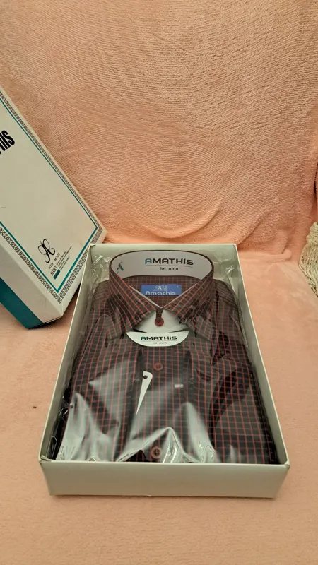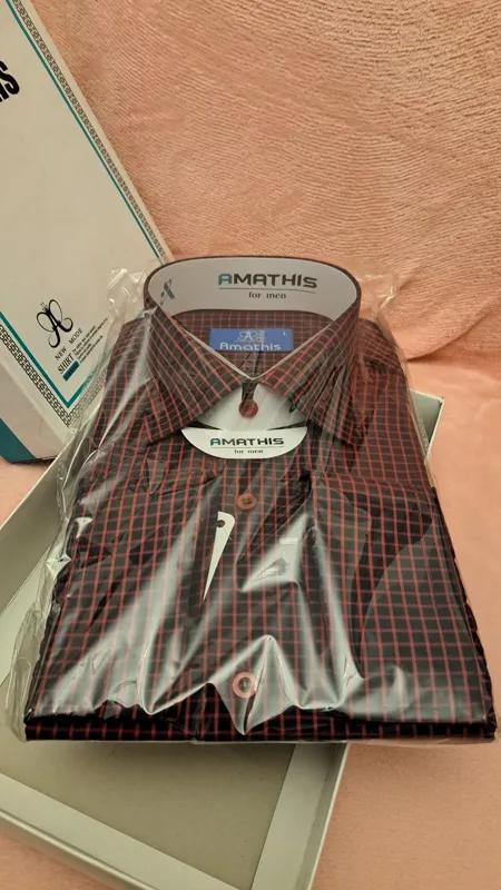 پیراهن مجلسی چهارخانه سورمه ای قرمز سایز لارج بسیار شیک و جعبه دار . مناسب هدیه دادن . پیراهن ایرانی است با مارک آماتیس مناسب آقایان و جوانان شیک پوش