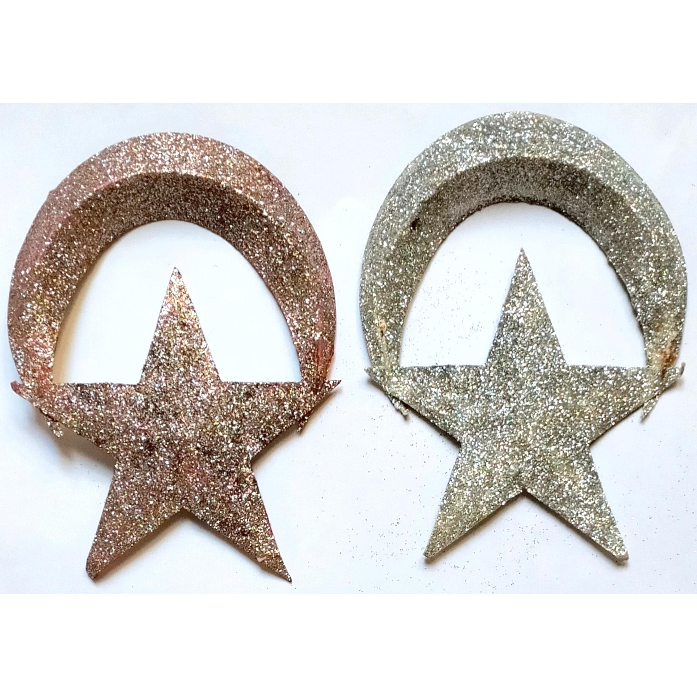 ماه و ستاره تزئین قدیمی اکلیل دار ، مجموعه ی 2 عددی در 2 رنگ مختلف ، اصل و کلکسیونی ، مقوایی ، در حد نو و آکبند قدیمی ، ته انباری
