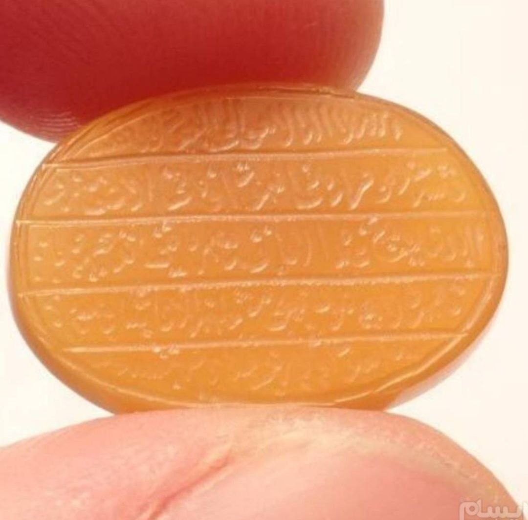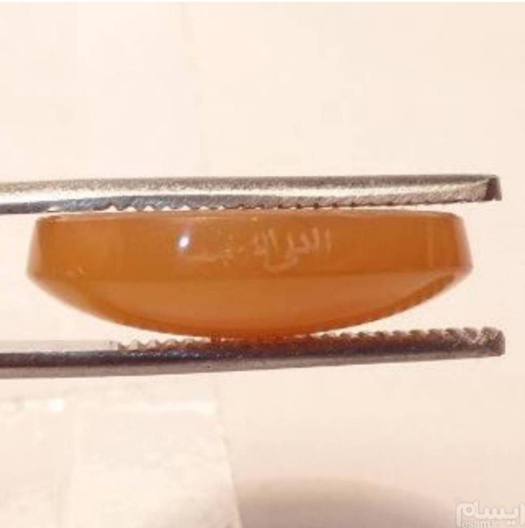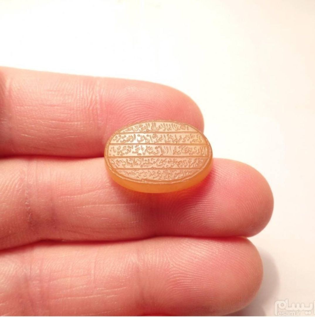 یک قطعه جزع یمنی کهنه عسلی خوش رنگ و خوش طبع و عالی و خوش تراش با تراش عالی رو تخت و زیر گرد یمن که بر روی آن با خط قدیمی و به سبک کوپال و بسیار زیبا و عالی و با کرسی چینی آیه ( آیتالکرسی) با ابزار قدیمی حکاکی و تذهیب کاری گردیده است