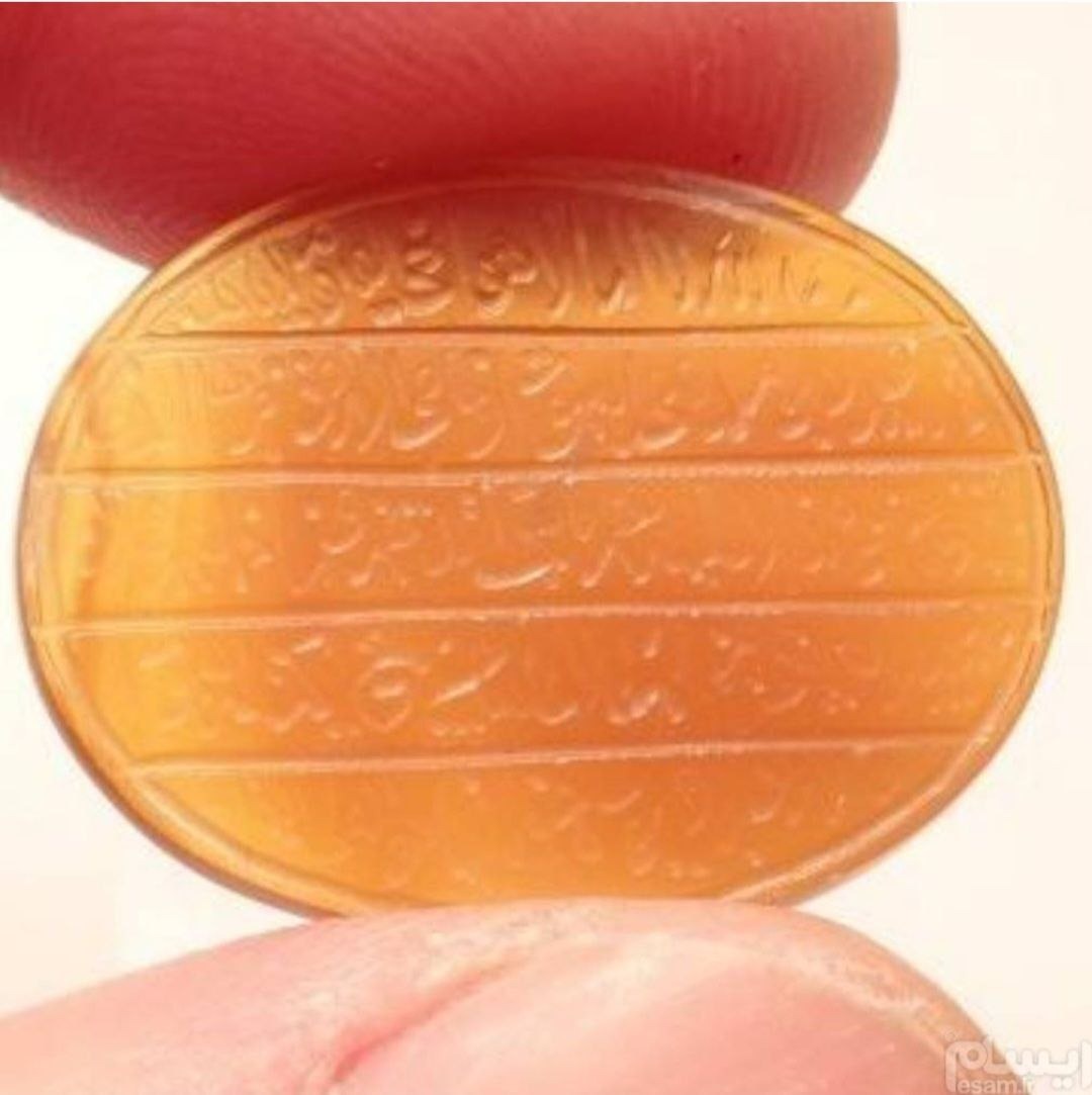 یک قطعه جزع یمنی کهنه عسلی خوش رنگ و خوش طبع  و عالی و خوش تراش با تراش بیضی رو تخت و زیر گرد یمن که بر روی آن با خط قدیمی و به سبک کوپال و بسیار زیبا و عالی با کرسی چینی آیه ( آیتالکرسی) با ابزار قدیمی حکاکی و تذهیب کاری گردیده است