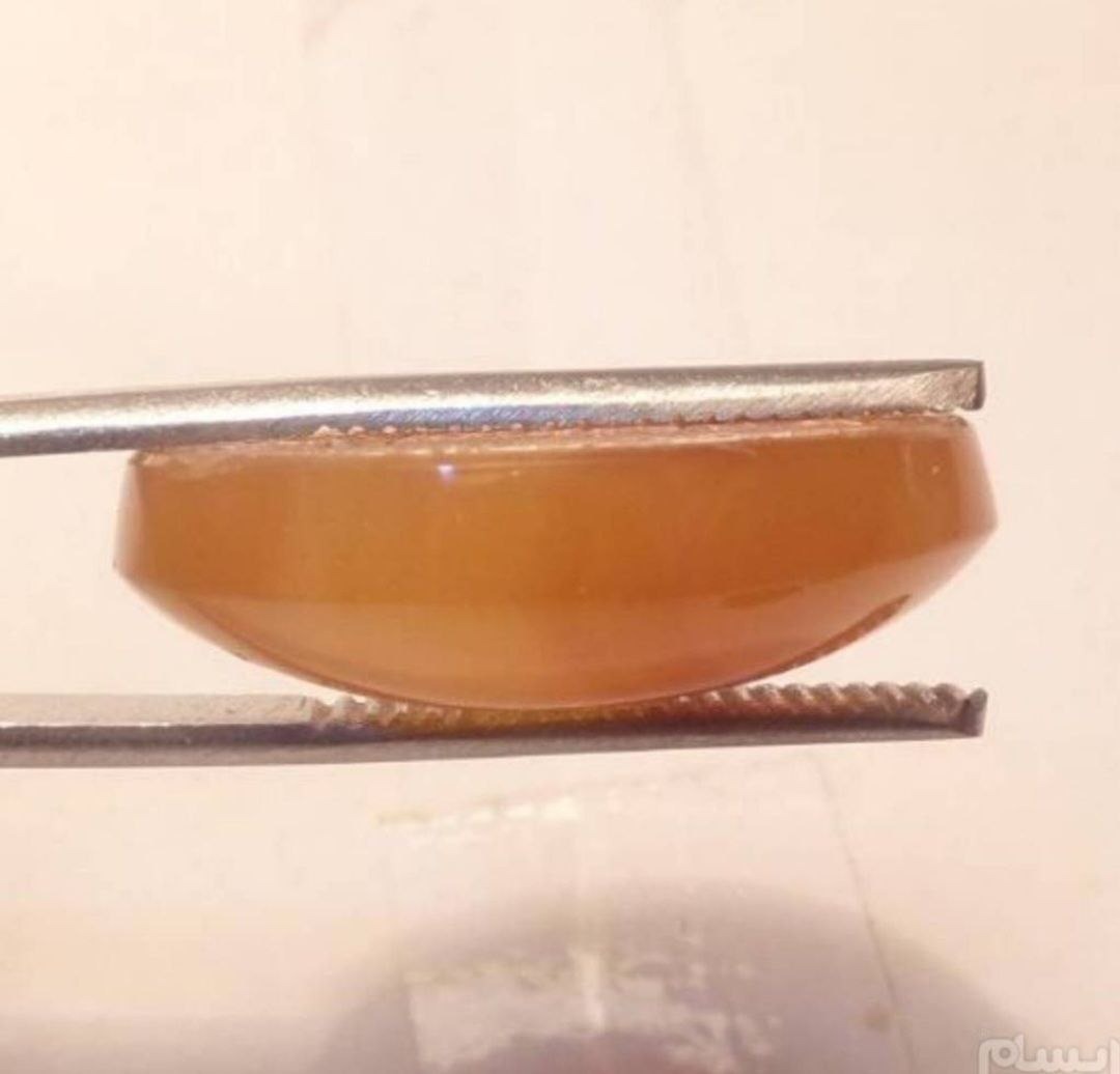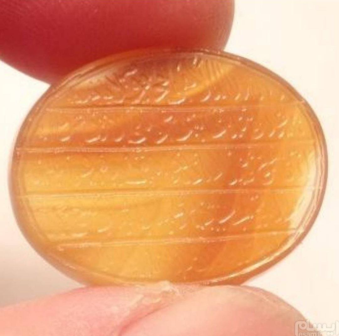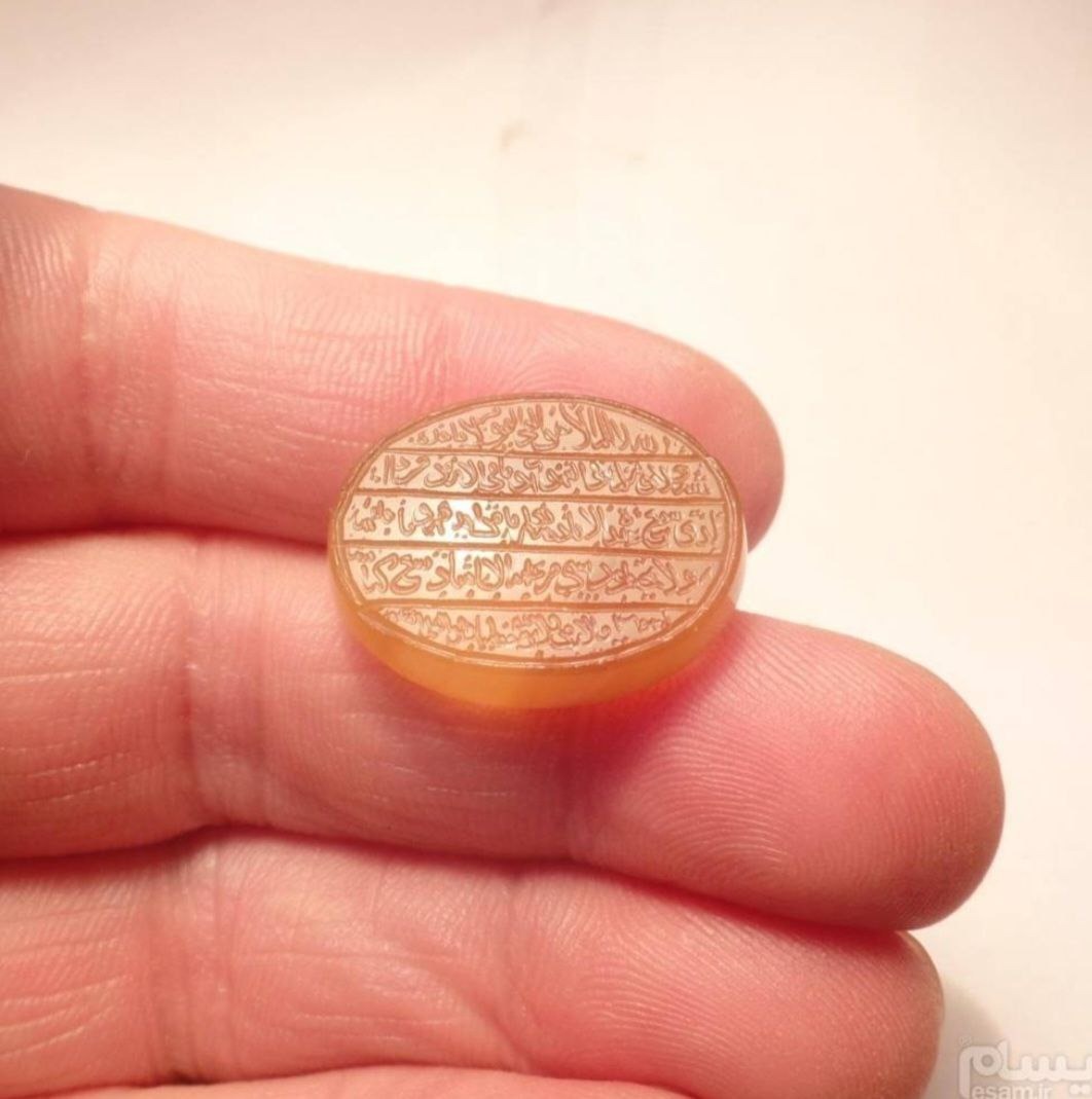 طرح : یک قطعه جزع یمنی کهنه عسلی خوش رنگ و خوش طبع با رگه های سلیمانی تیره و روشن زیبا و خوش تراش با تراش رو نسبتا تخت و زیر گرد یمن که بر روی آن با خط قدیمی و به سبک کوپال و بسیار زیبا و عالی با کرسی چینی خوب آیه : ( آیة الکرسی ) با