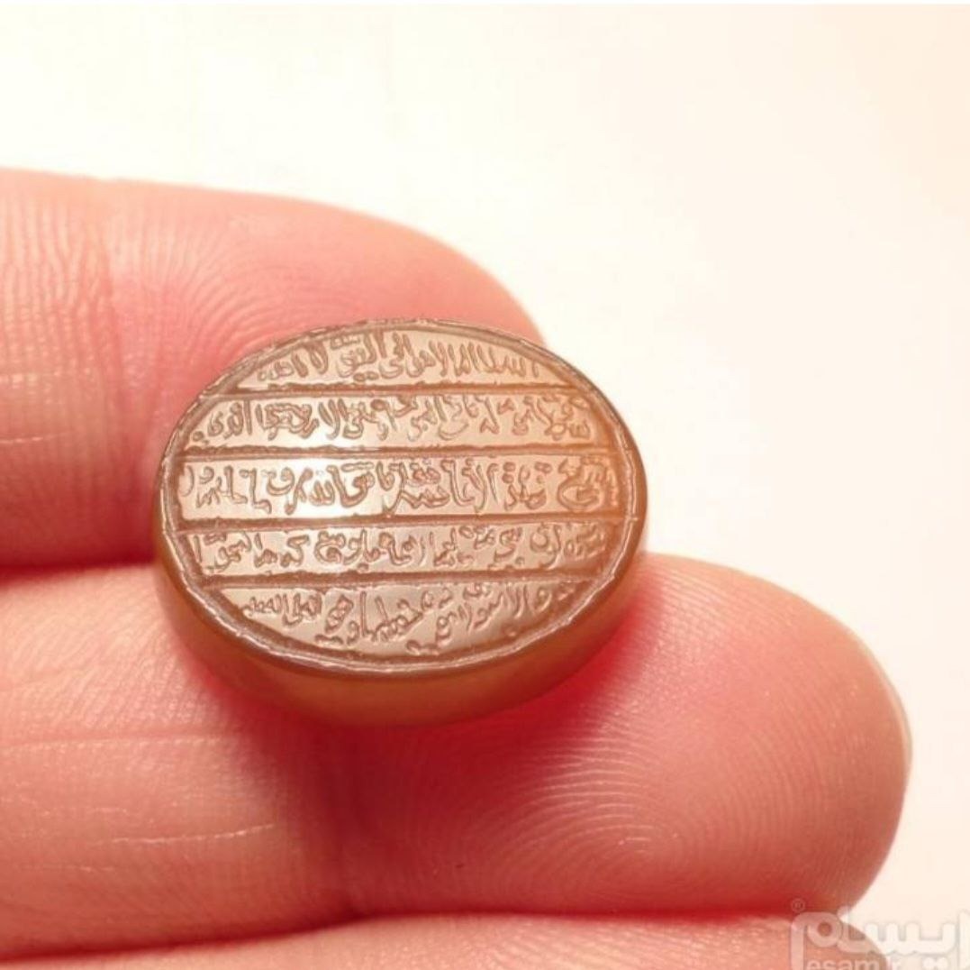 یک قطعه جزع خط یمنی کوپال کهنه قهوه ای رنگ خوش رنگ و خوش طبع رگه دار ابر دار و خوش تراش با تراش نسبتا تخت رو و زیر گرد یمن که بر روی آن با خط قدیمی و به سبک کوپال و بسیار زیبا و عالی و با خط کرسی چینی آیه( آیت الکرسی) با ابزار قدیمی حکاکی گردیده است