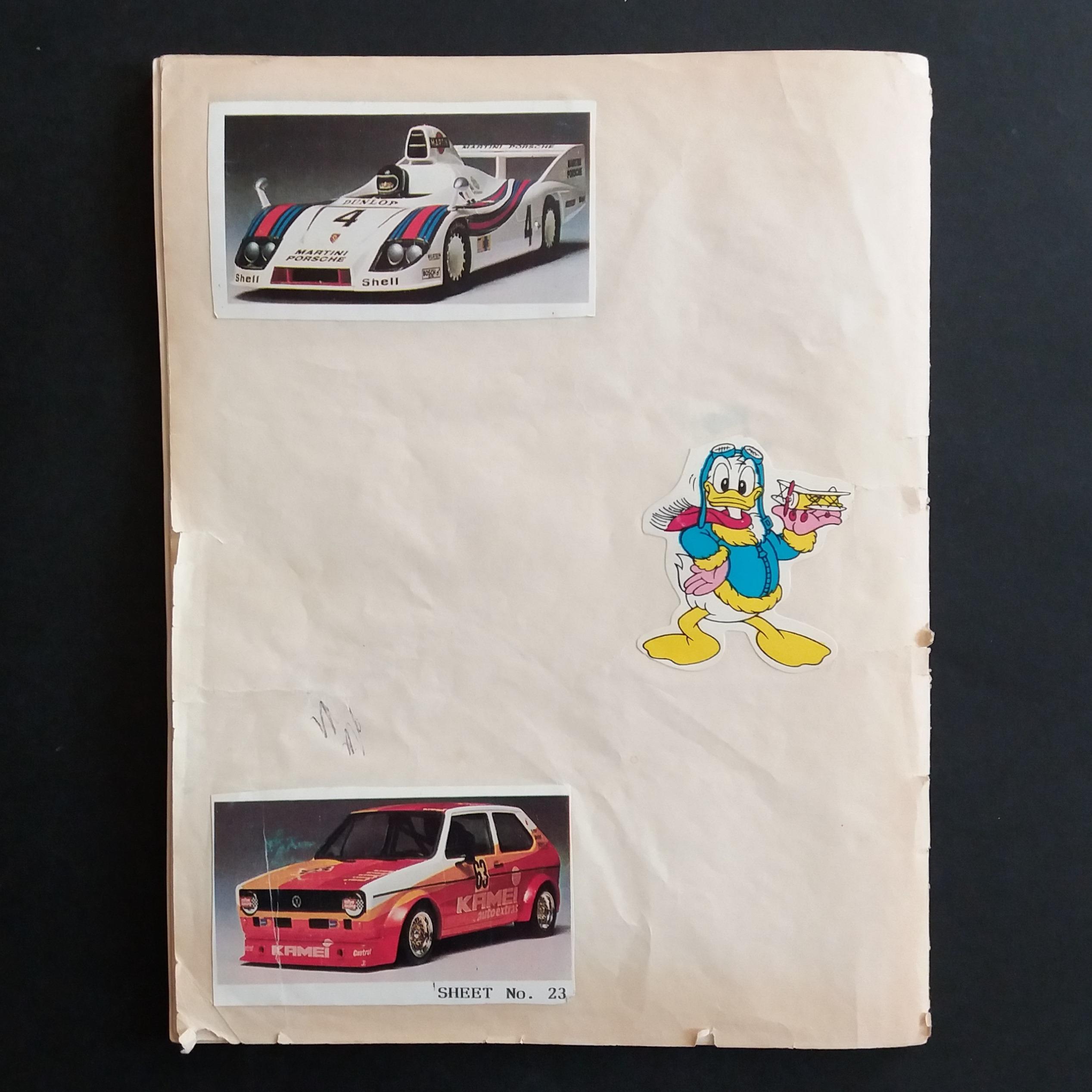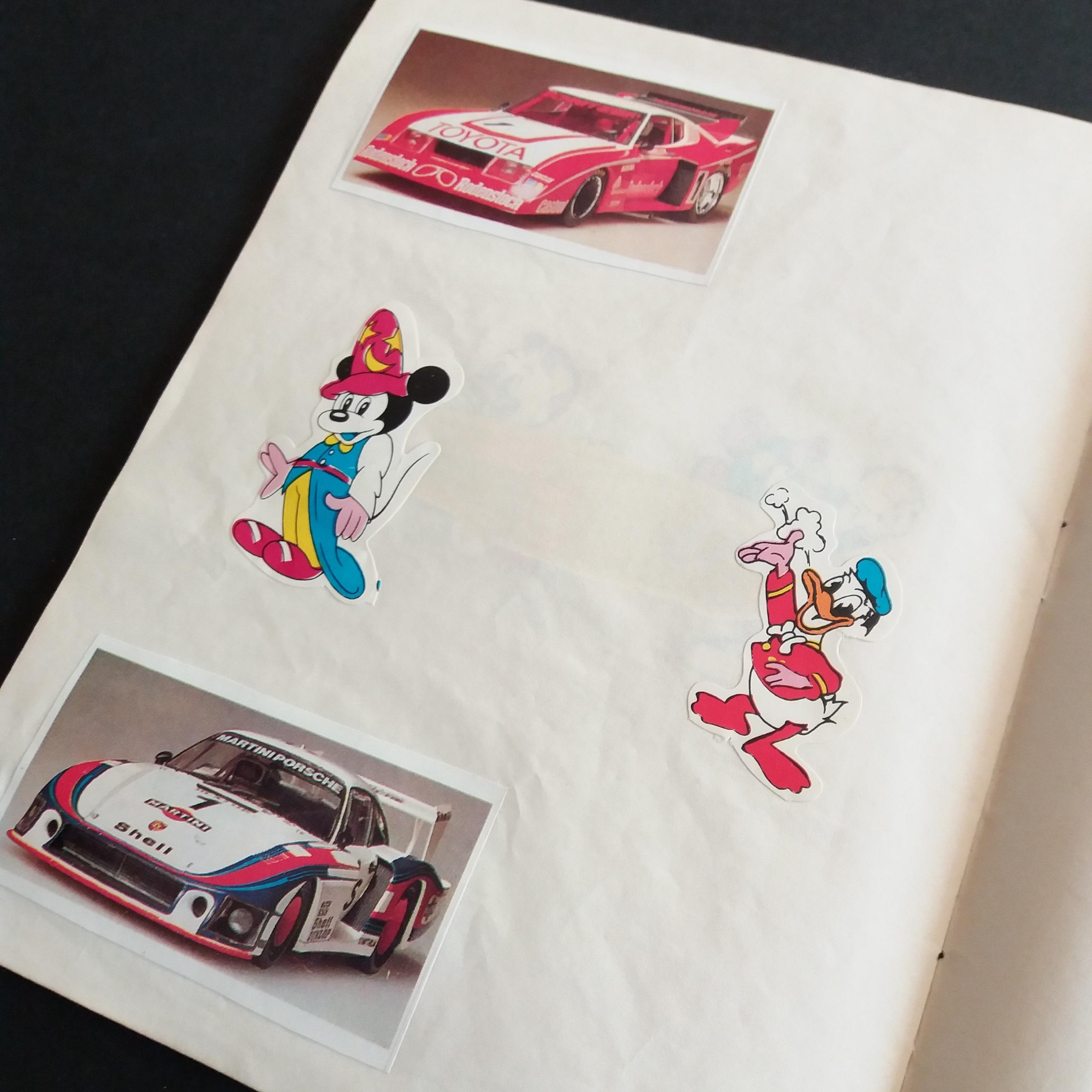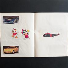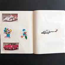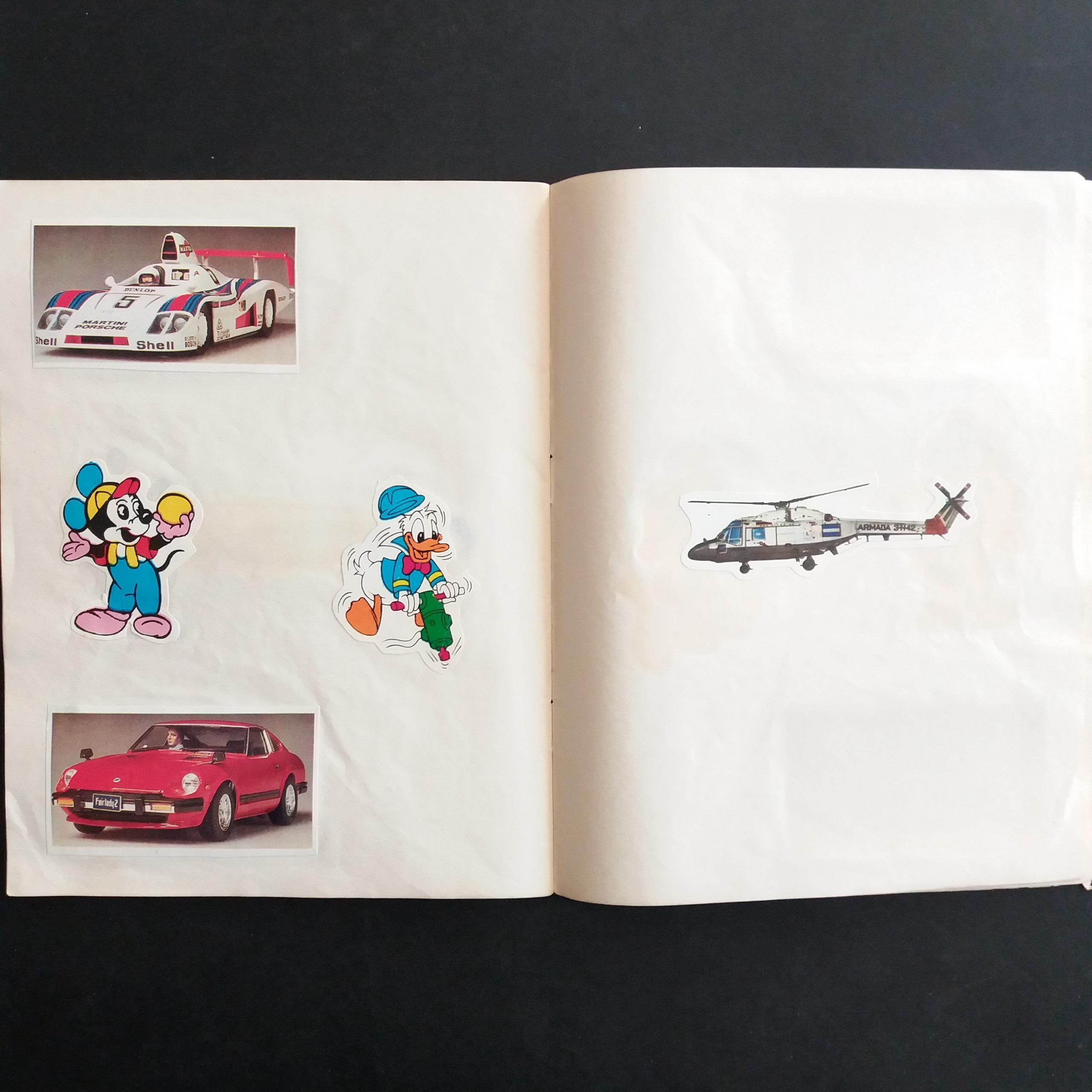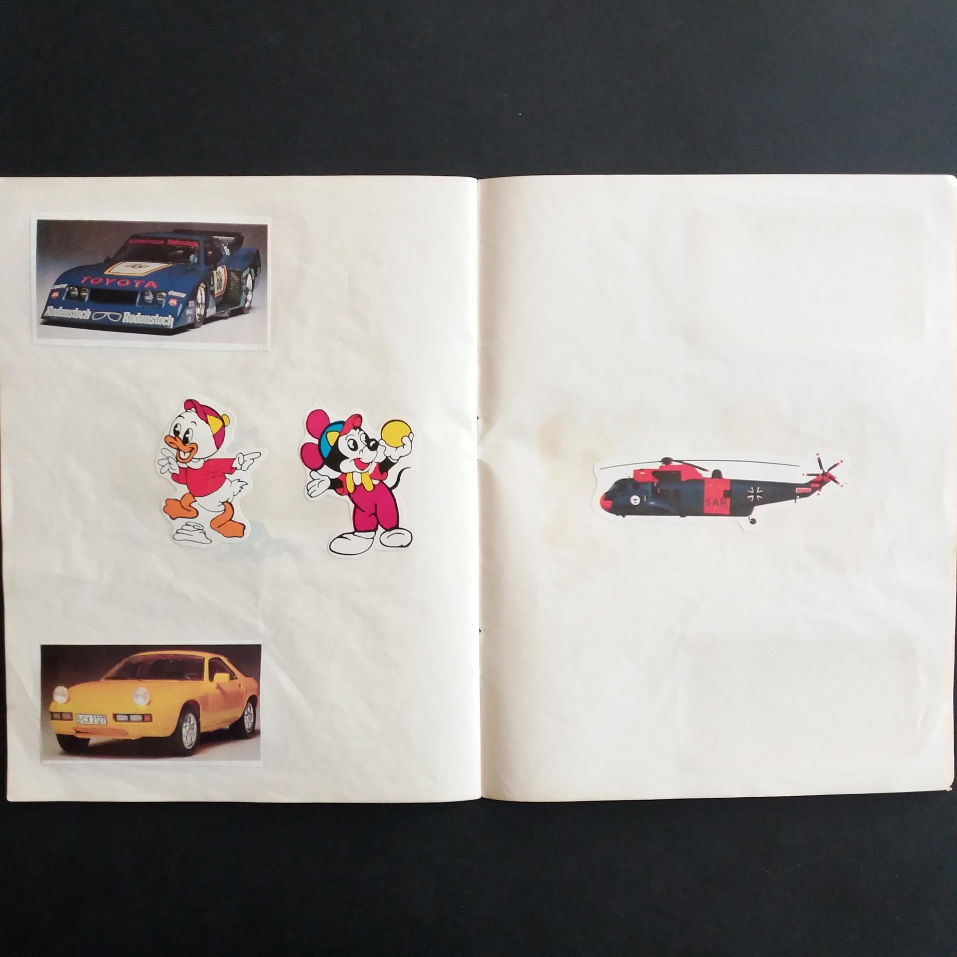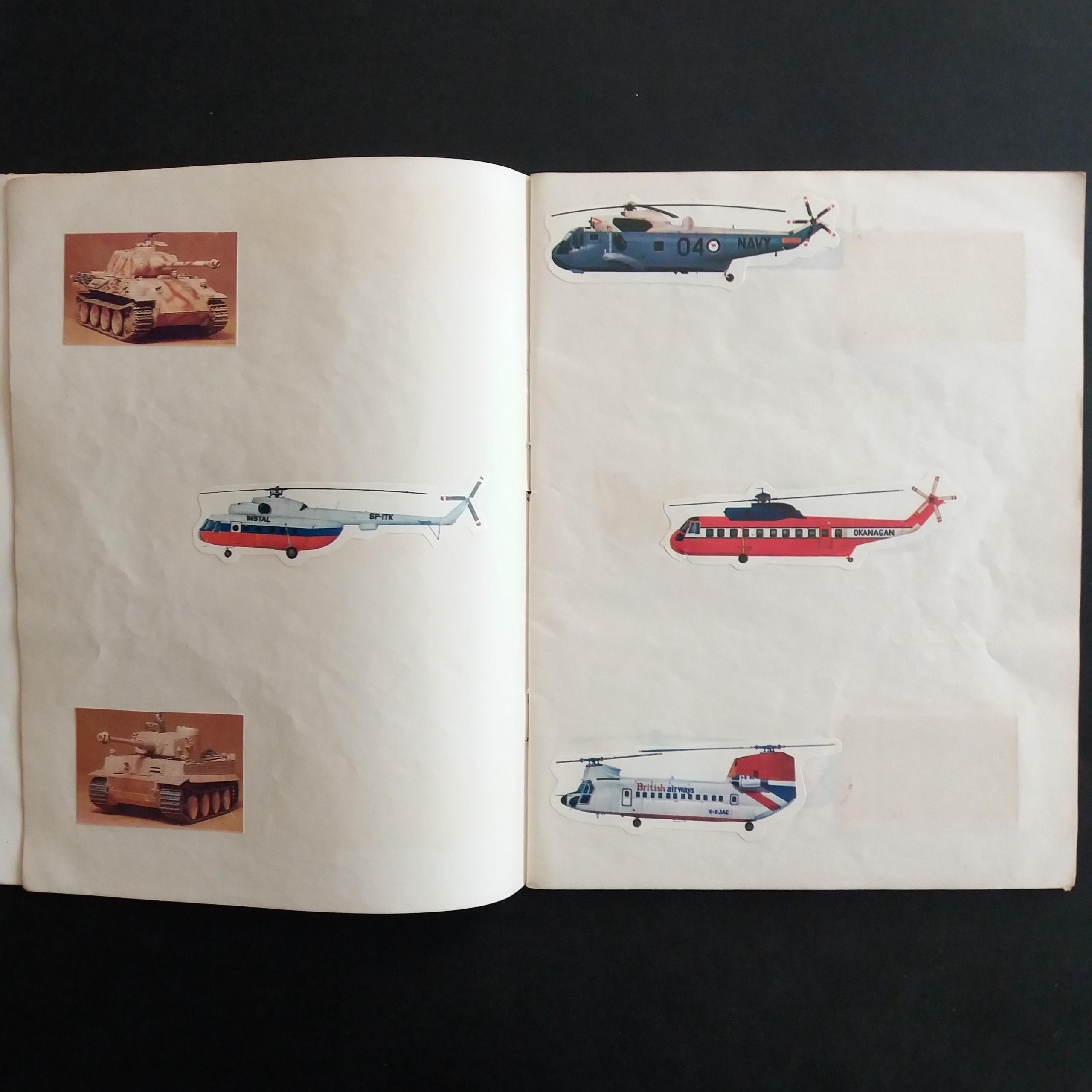 یک عدد دفتر قدیمی و خاطره انگیز شامل انواع عکس های برچسبی ماشینی ، هواپیما و هلکوپتر ، تانک و کارتونی .