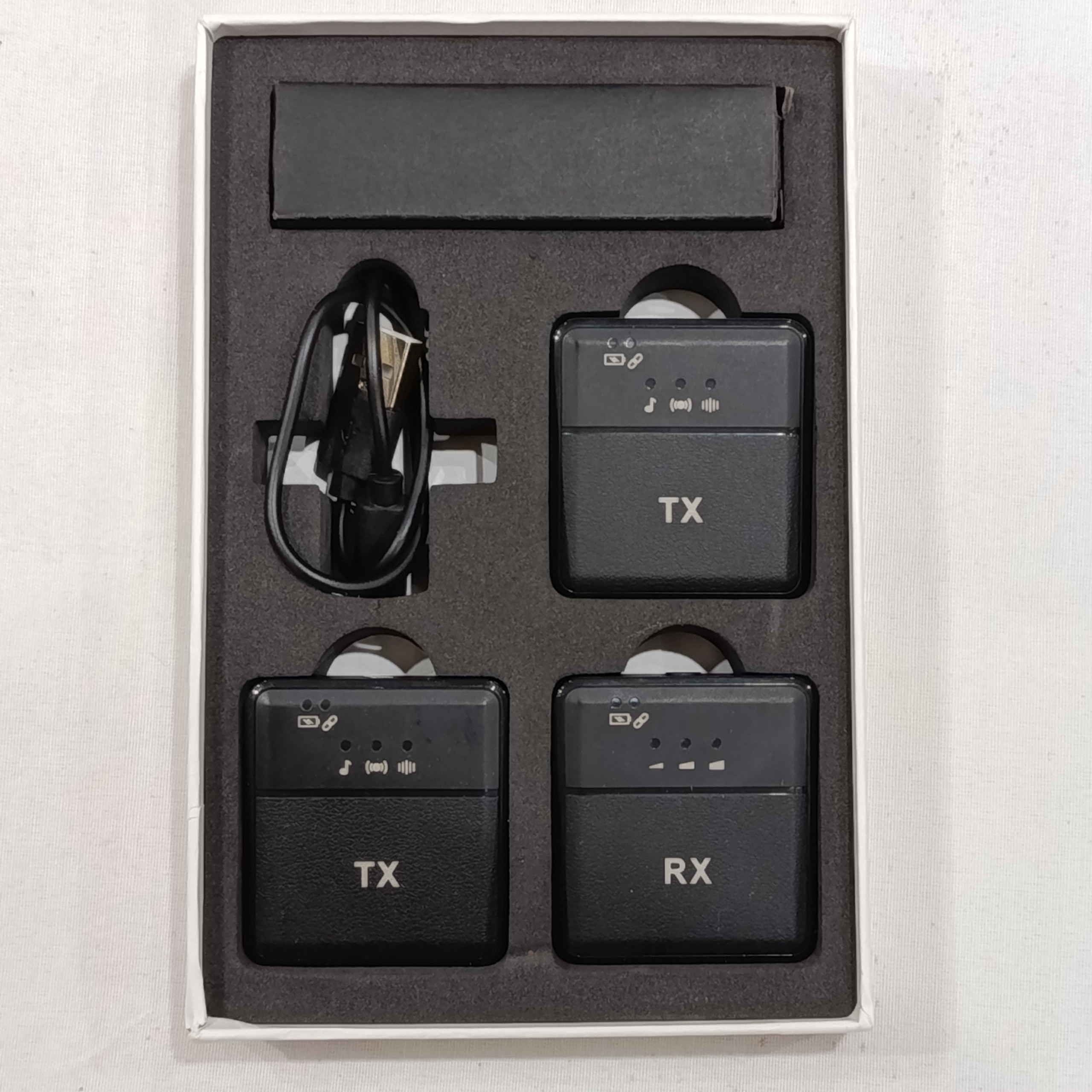 اقلام داخل جعبه شامل دو عدد فرستنده TX، یک گیرنده RX، تمام کابلها و مبدلهای لازم، کابل شارژ و بستهبندی اصلی است. دستگاه کاملاً سالم، تمیز و تستشده بوده و هیچگونه مشکل اتصال یا نویزی ندارد.