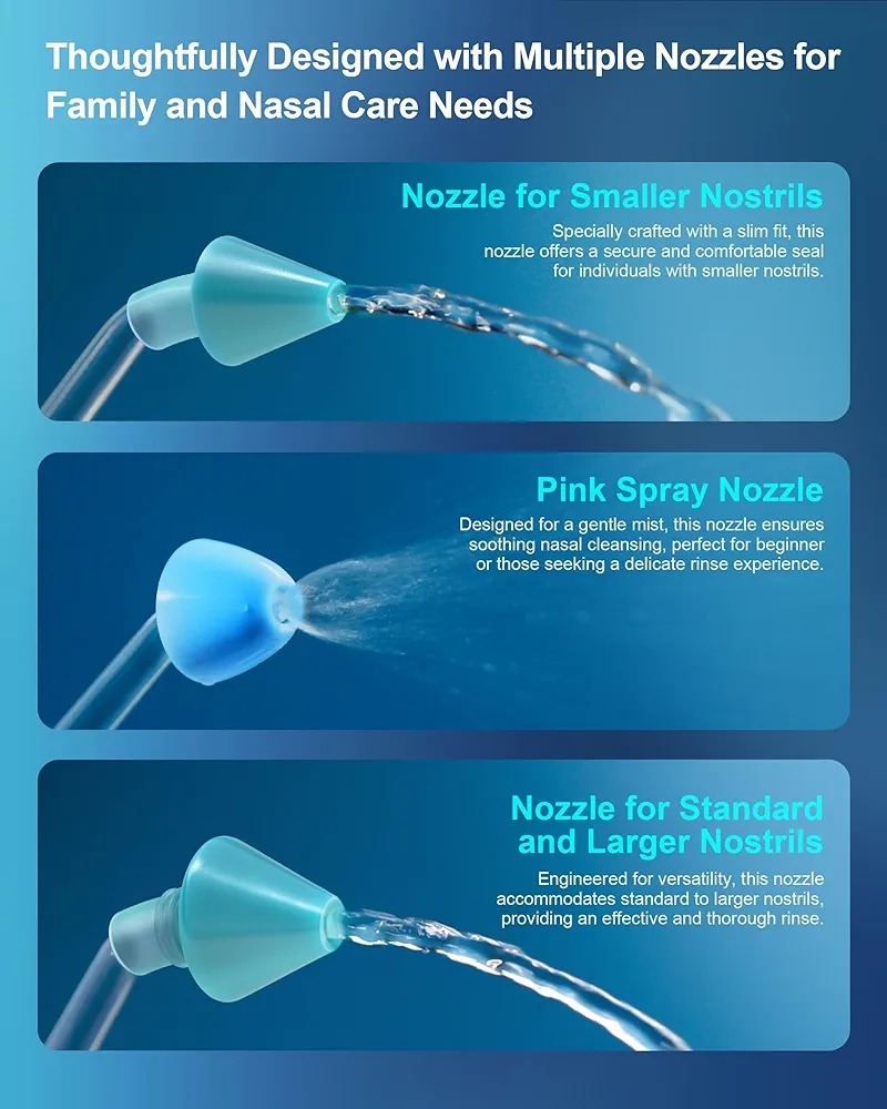 ست جامع شستشوی بینی دستگاه شستشوی بینی شامل 6 نازل است - 4 نازل آب برای بزرگسالان و 2 نازل برای مبتدیان. نازل با قابلیت چرخش 360 درجه و مخزن آب 300 میلیلیتری، هر آنچه را که برای شستشوی مؤثر بینی نیاز دارید، فراهم میکند.