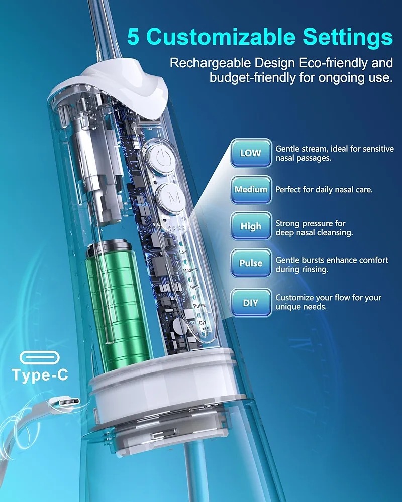 مزایای شستشوی بینی برقی: شستشوی موثر بینی برای تنفس تازه شستشوی بینی برقی از فناوری نوآورانه پالس برای تمیز کردن کامل و ملایم بینی استفاده میکند. در مقایسه با روشهای سنتی، این دستگاه شستشوی سینوس به طور موثری مخاط را از بین میبرد و سینوسها را تمیز میکند و امکان تنفس آسانتر را فراهم میکند.