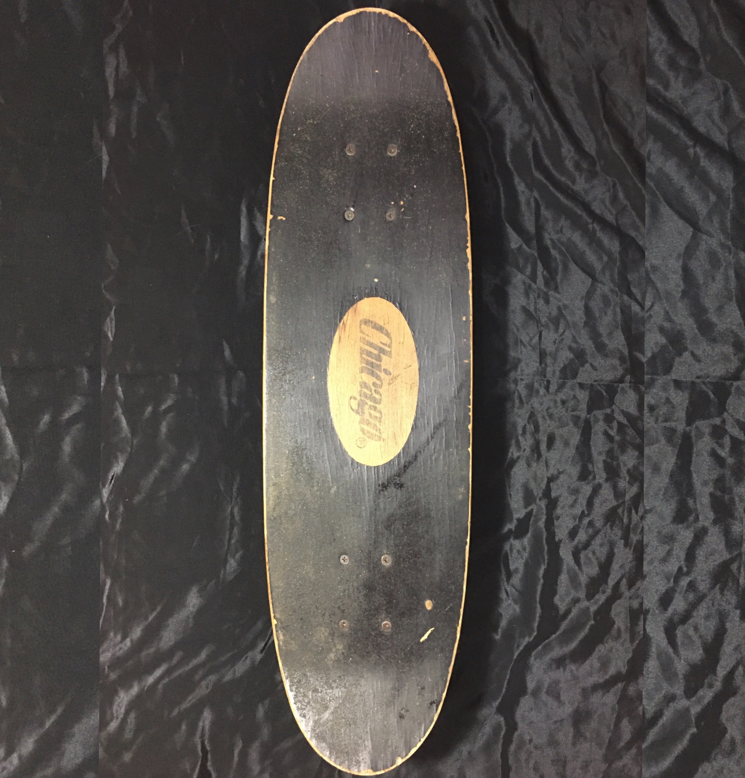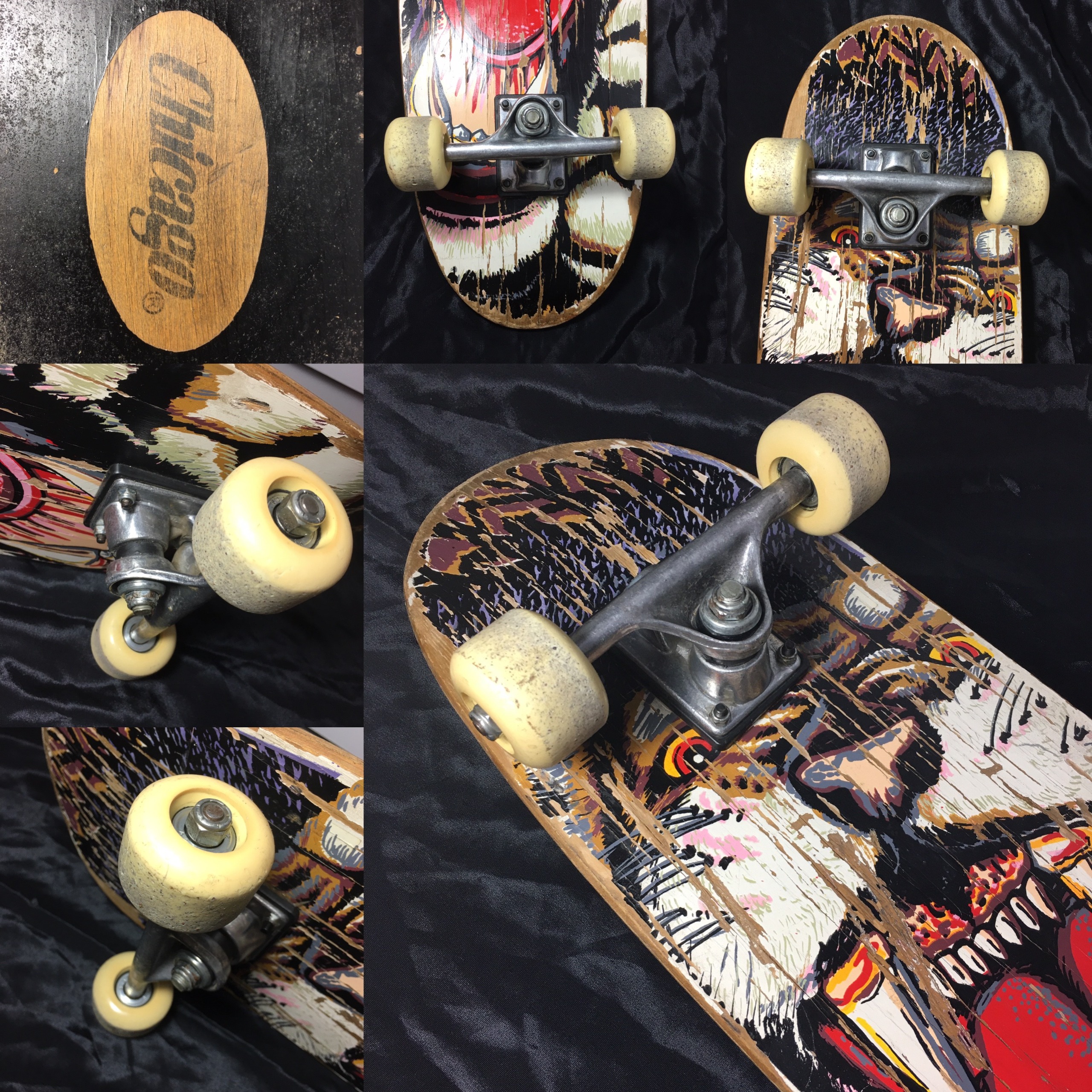 یک اسکیت برد وارداتی با کیفیت خوب و دِک طرح ببر که در سطح رویی آن برند Chicago نوشته شده.