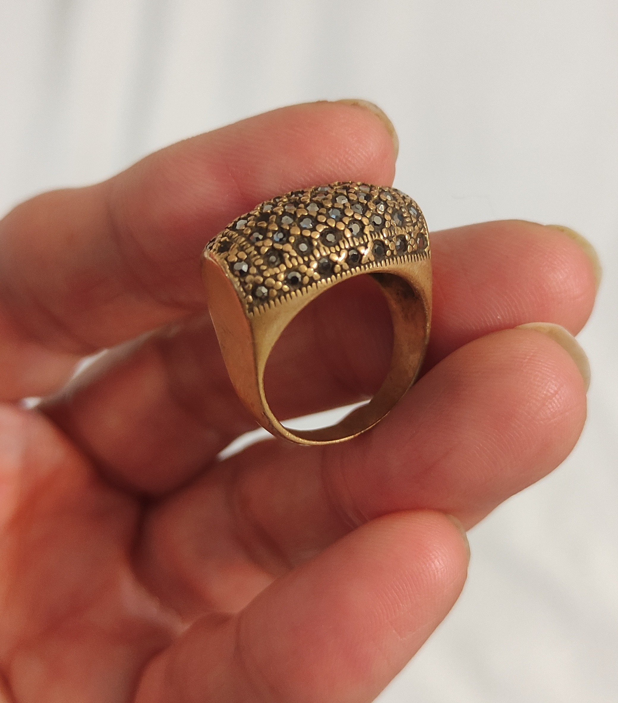 انگشتر برنجی پر نگین وپر جلوه.رنگ ثابت شبیه طلا،نگین ها مخراج کاری شده