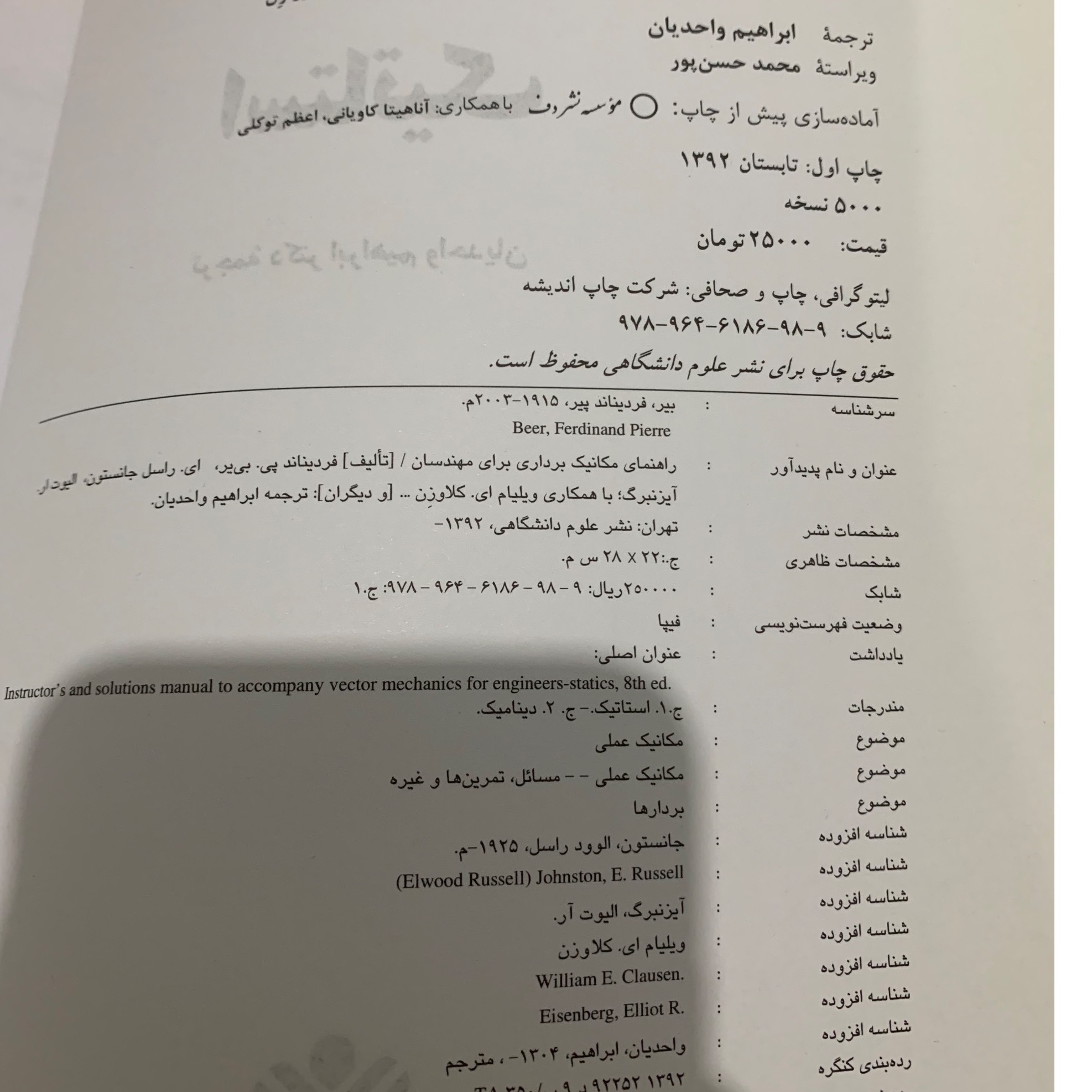 استاتیک جانستون 2 جلدی( کتاب  حل المسائل)
