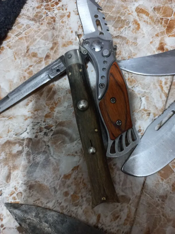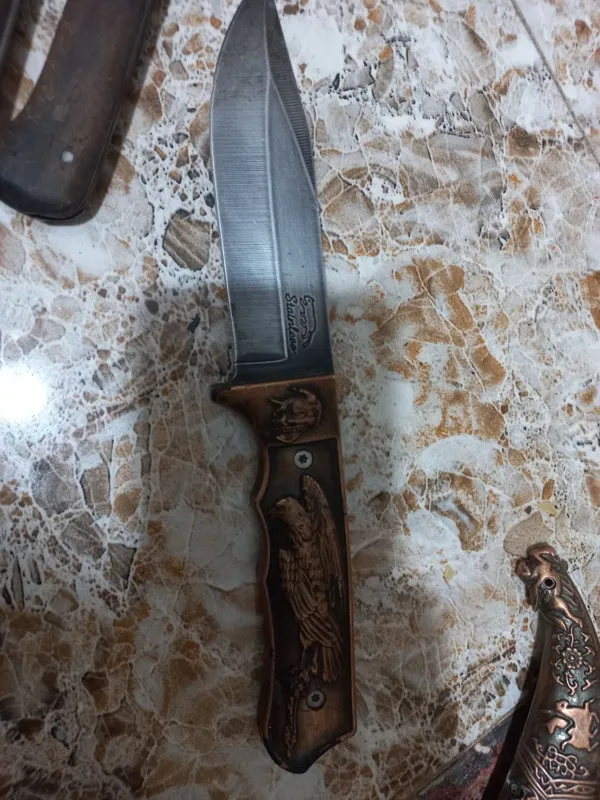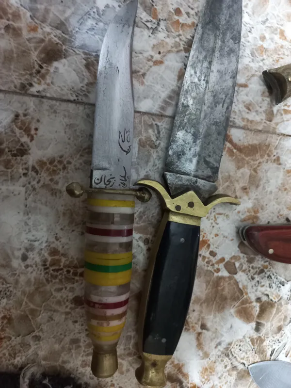 چاقوهاهمگی دست سازقدیمی وکلکسیونی هستن دوتااولی دشنه امضادارتیغه فولادودسته برنج سنگین هستن عکس سوم ضامن دهرشاخ هست که قفل وکمیاب هست همگی اصل اگرهنه روهم کسی بخوادتخفیف خوبی میدم اگرخواستین قیمت هرکدوم فرق میکنه