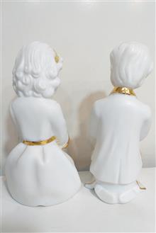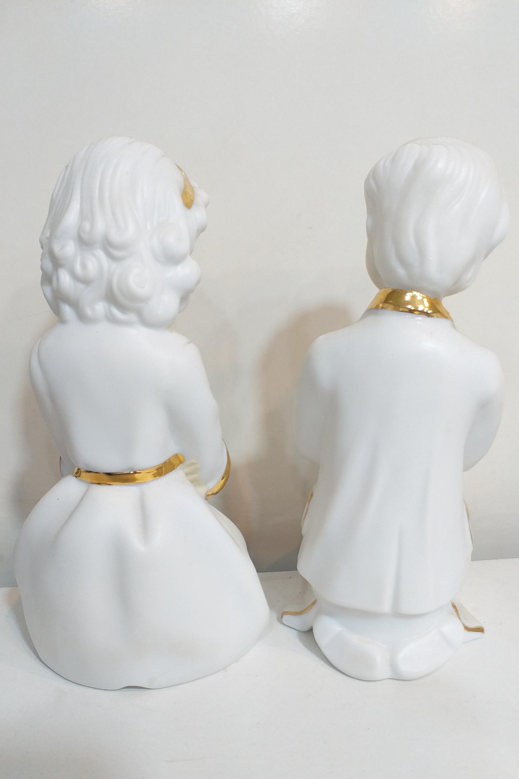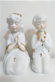 دو مجسمه زیبا و ظریف از جنس پرسلان سفید با تزیینات طلایی، نشان دهنده معصومیت و نیایش کودکانه.