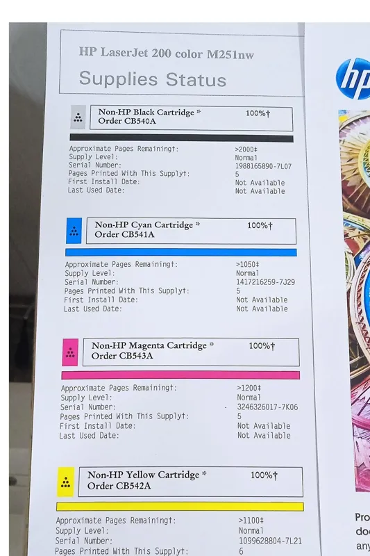 خیلی تمیز و کم کار. تازه کارتریجهاش رو نو کردم،  اصلا تعمیر نشده.، سرعت چاپ بالا.سری اصلی،هر سری رنگ نزدیک 1000تا 1500 چاپ رنگی میزنه بستگی به میزان رنگ هر کاغذ، با کابل اترنت هم وصل میشه،وزنش 24 کیلو هست مجبورم با تیپاکس بفرستم.  کارتن ندارد ولی کابل دیتا ، کابل برق و سی دی درایور دارد