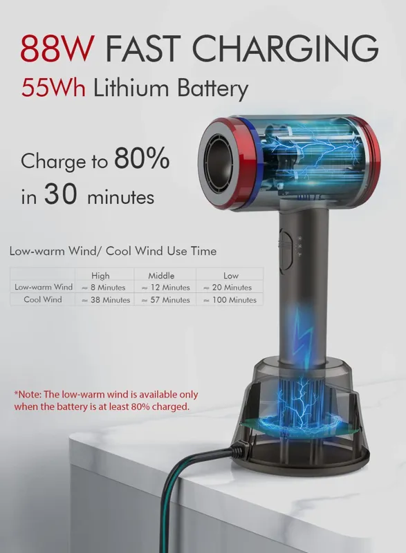 شارژ سریع 88 واتی: سشوار را می توان در 30 دقیقه تا 80 درصد و در 50 دقیقه 100 درصد شارژ کرد. به طور کلی، هنگام استفاده از این سشوار یونی منفی، می توانید از باد با سرعت بالا و دمای پایین به مدت 6-8 دقیقه و باد سرد با سرعت پایین تا 100 دقیقه استفاده کنید. ما از یک باتری با ظرفیت 55.5 وات ساعت برای اطمینان از استقامت خوب استفاده می کنیم، به این معنی که سشوار کمی سنگین تر از سشوار سیمی است و به 1.4 پوند می رسد. لطفا قبل از ثبت سفارش دو بار فکر کنید.