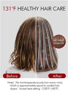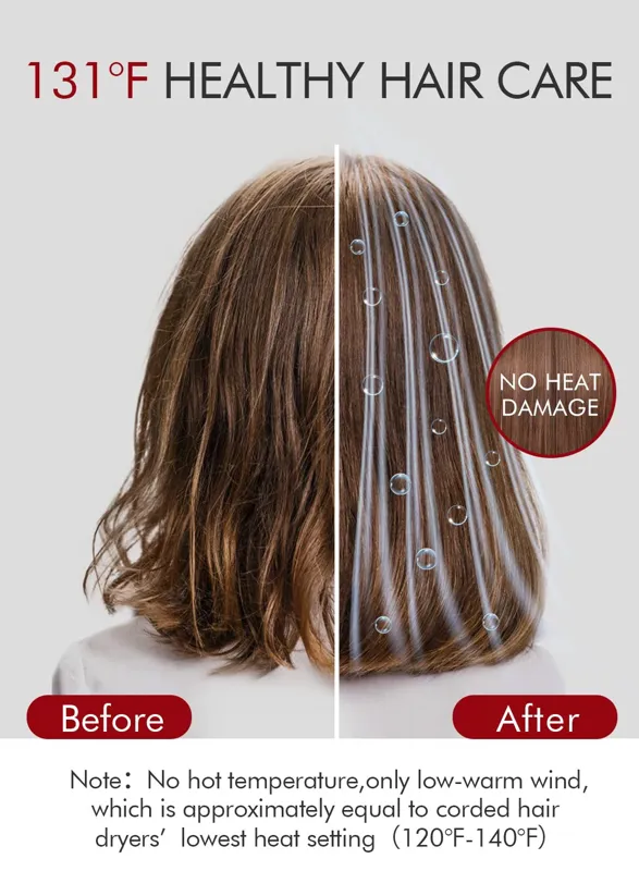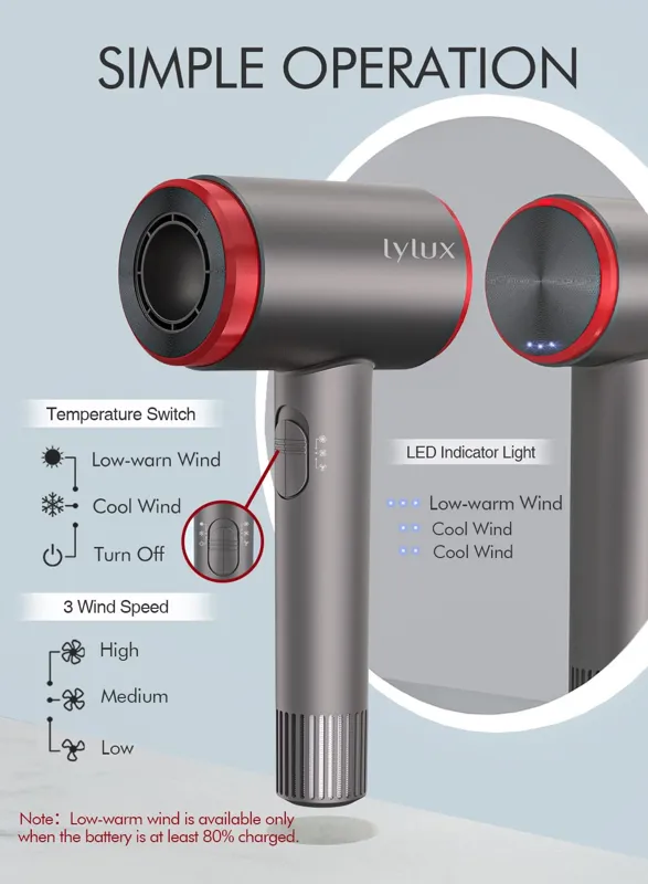 بدون دمای داغ: کمترین درجه حرارت در اکثر سشوارهای سیمی 120 ~ 140 است. سشوار شارژی Lylux دمای ثابت را در دمای 131 درجه سانتیگراد کنترل می کند تا از آسیب رساندن حرارت شدید به موهای شما جلوگیری کند و درخشندگی طبیعی آن را حفظ کند. دمای 131 درجه برای یک ظاهر طراحی شده به اندازه کافی گرم نیست. 131 جریان هوا فقط زمانی در دسترس است که حداقل 80 درصد شارژ باشد و آن را از موهای خود دور نگه دارید. شما را نمی سوزاند، که مخصوصا برای نوزادان، کودکان و افراد مسن مفید است.