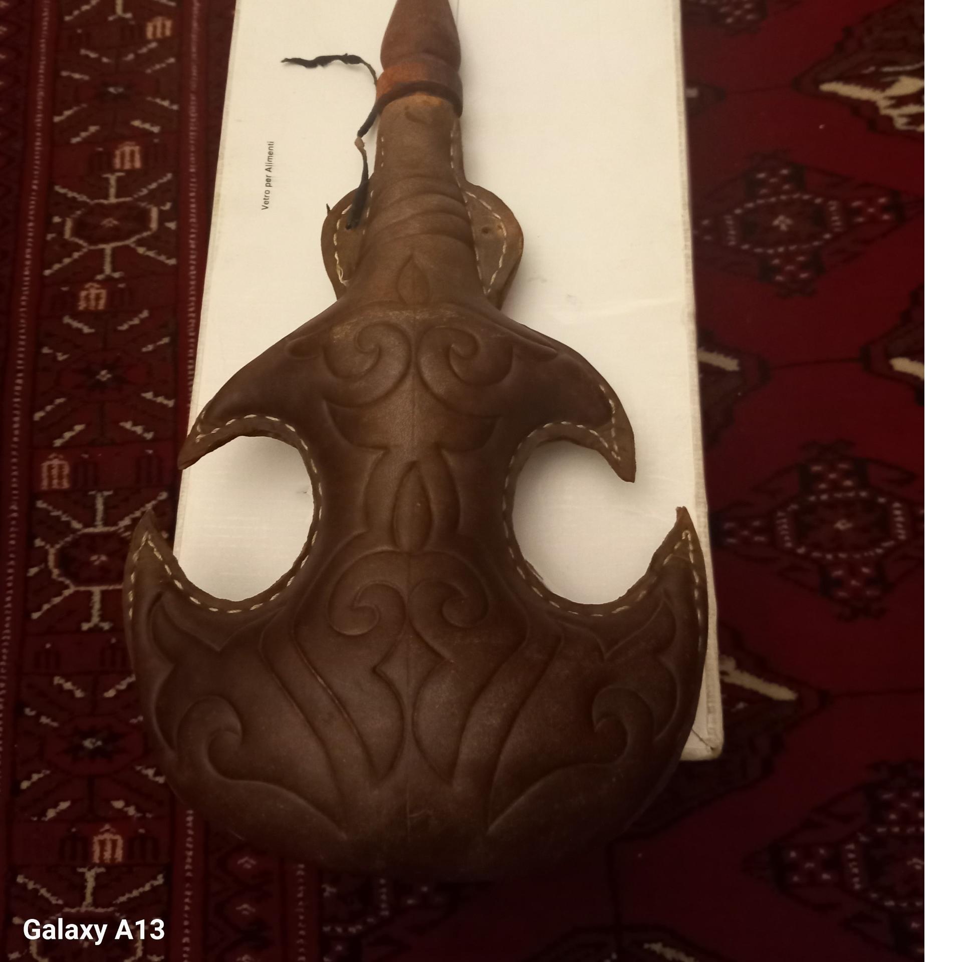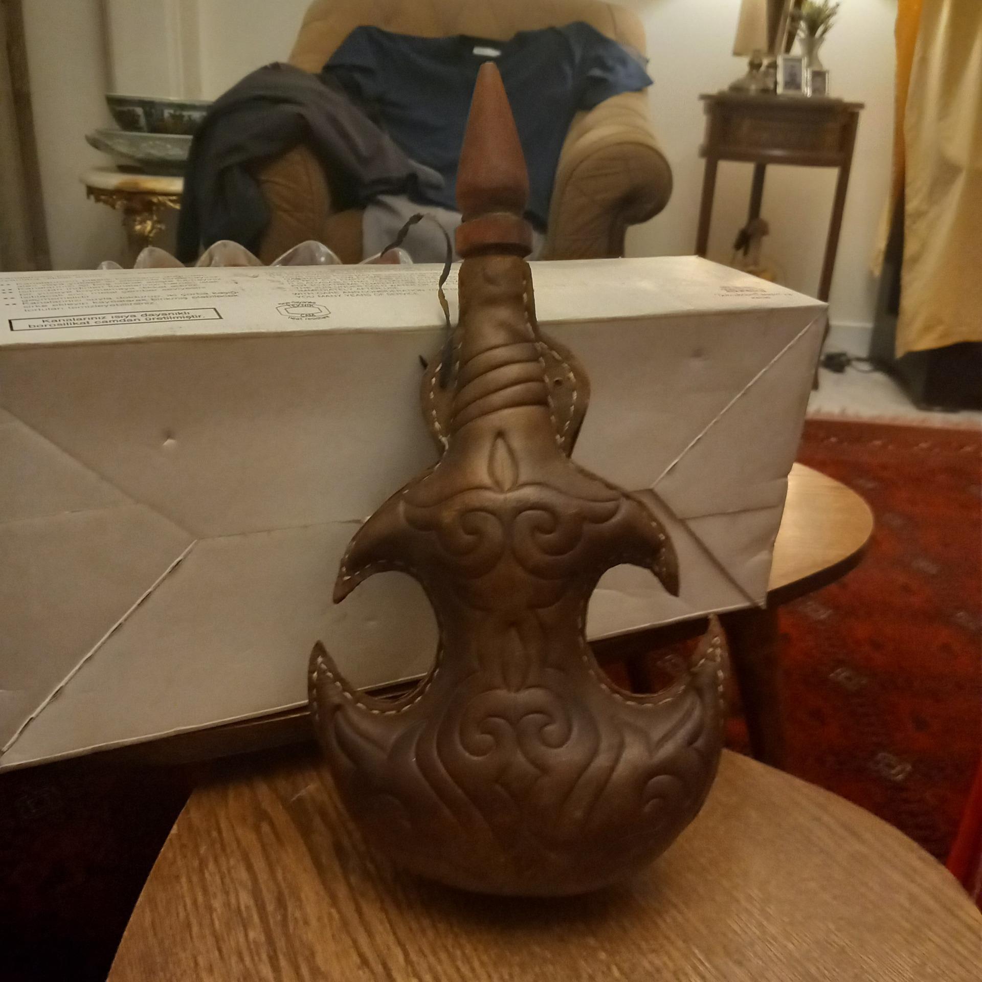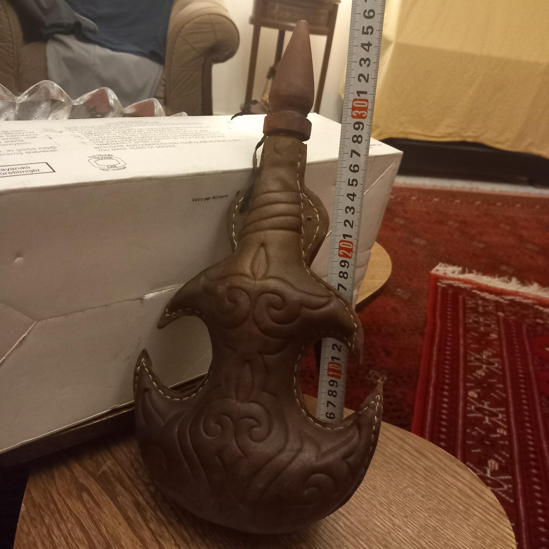 باروت دان روسی/ بسیار قدیمی و آنتیک/ بالای 120 سال قدمت/ از پوست درست شده وبسیار با ظرافت وهنرمندانه کار شده/ مخصوص کلکسیونرها/ بسیار نفیس و ارزشمند/ ارتفاع: 35سانت