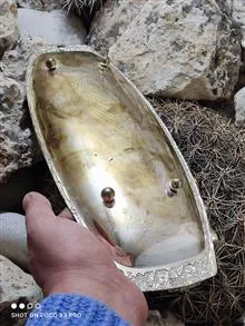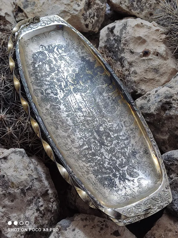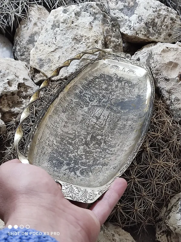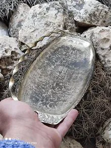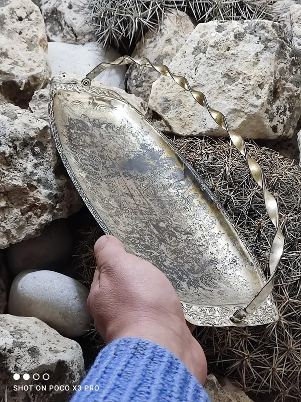 یک عدد سینی نسبتا قدیمی زیبا و خاص دسته دار دستش بالاش قرار گرفته همینم خاصش کرده