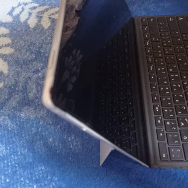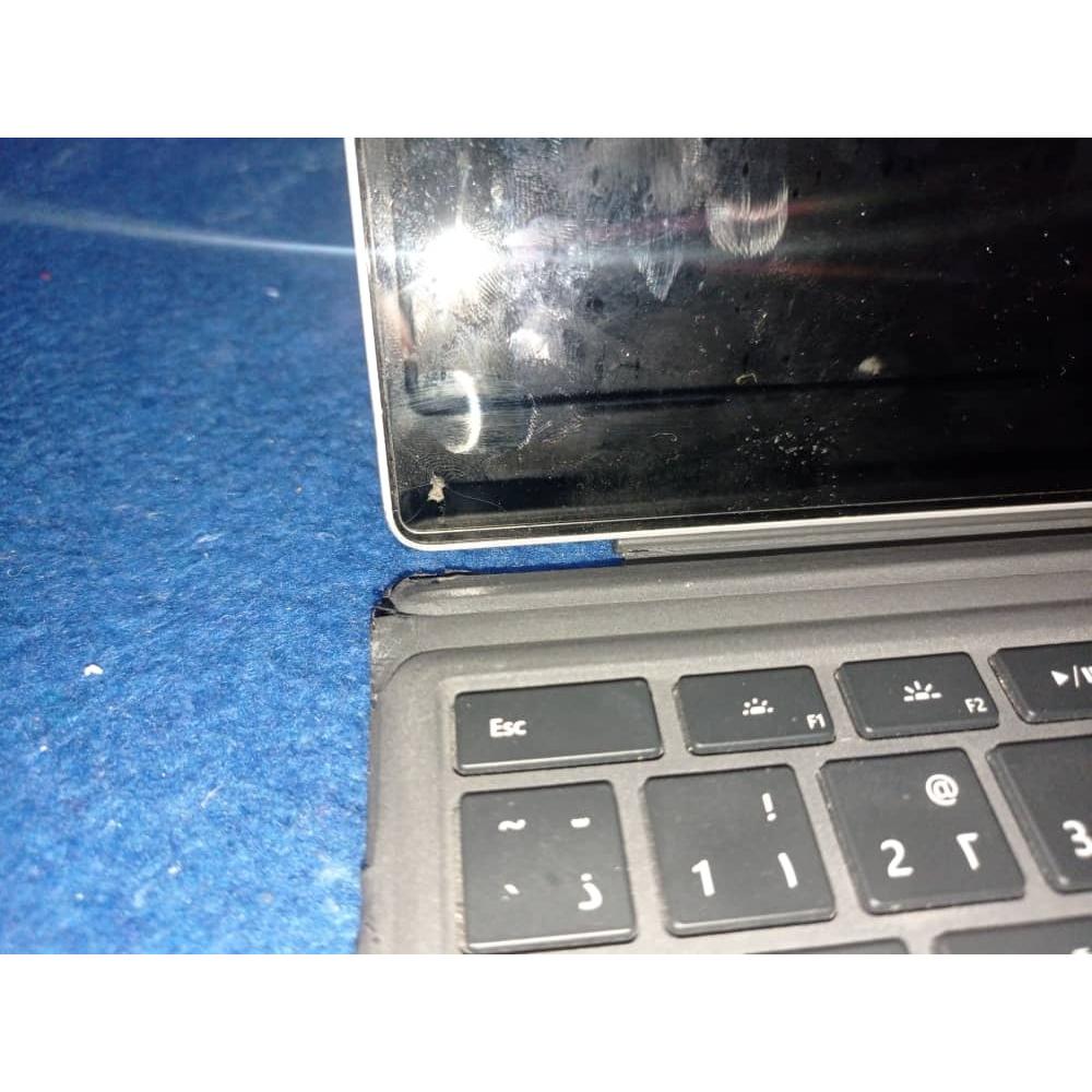 ضربه خوردگی سطحی در بالاش و سوراخ شدن برچسب ک تاثیری در تاچ نداره در سمت چپ پایین و فقط کیبورد پوسته پوسته شده