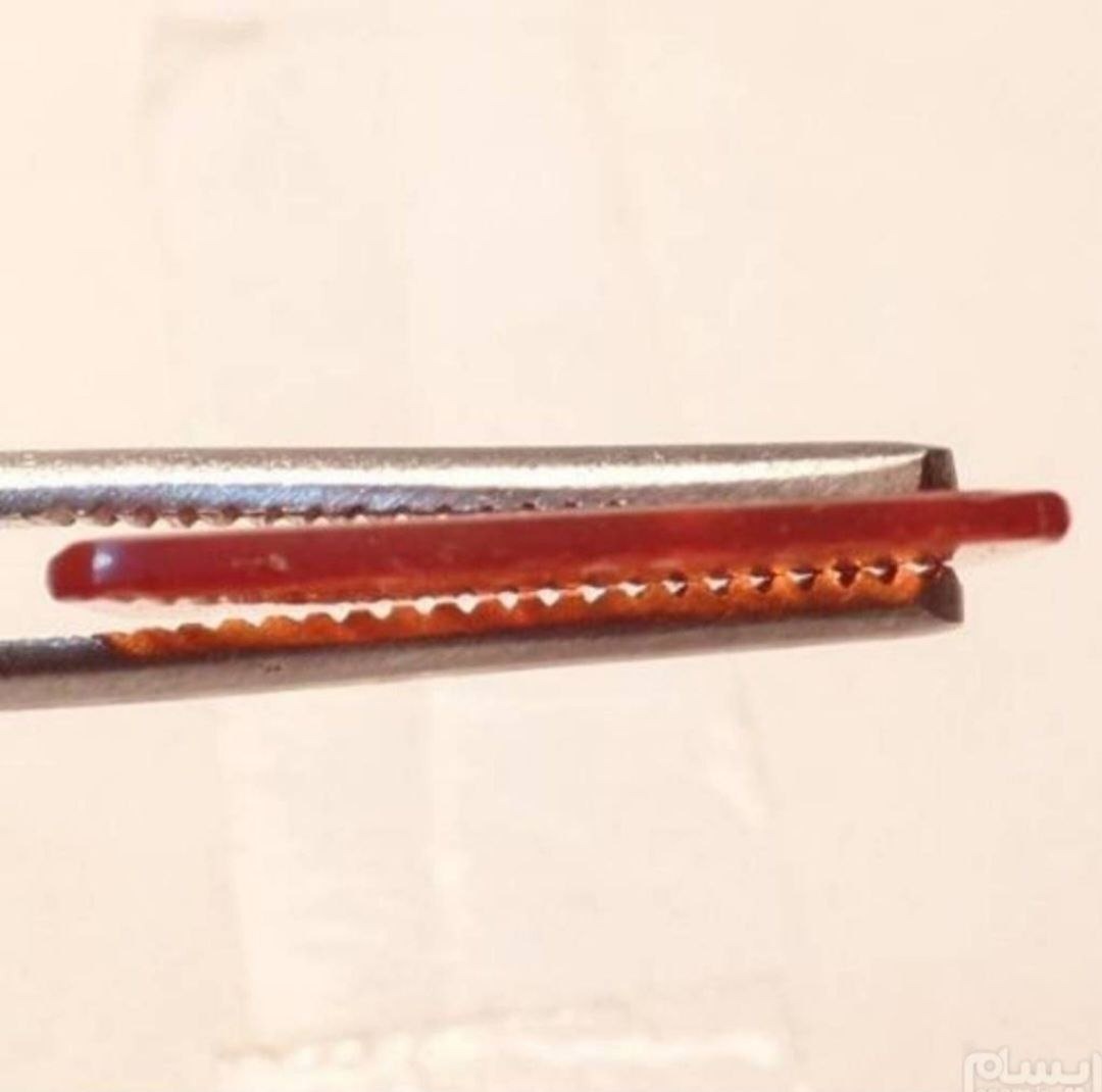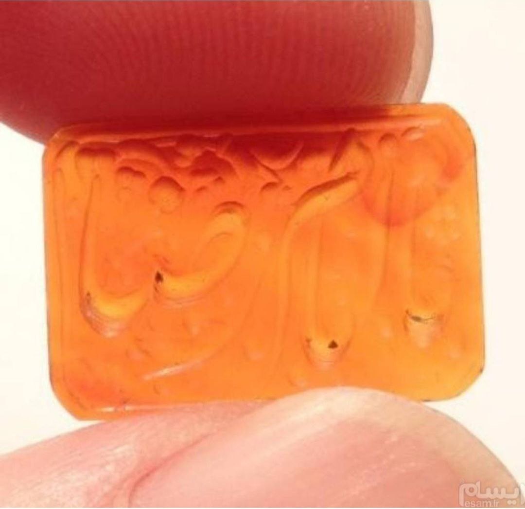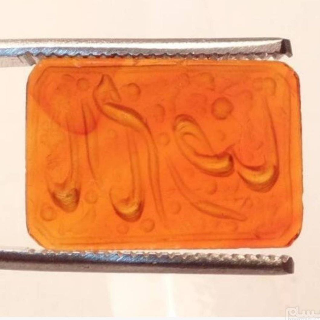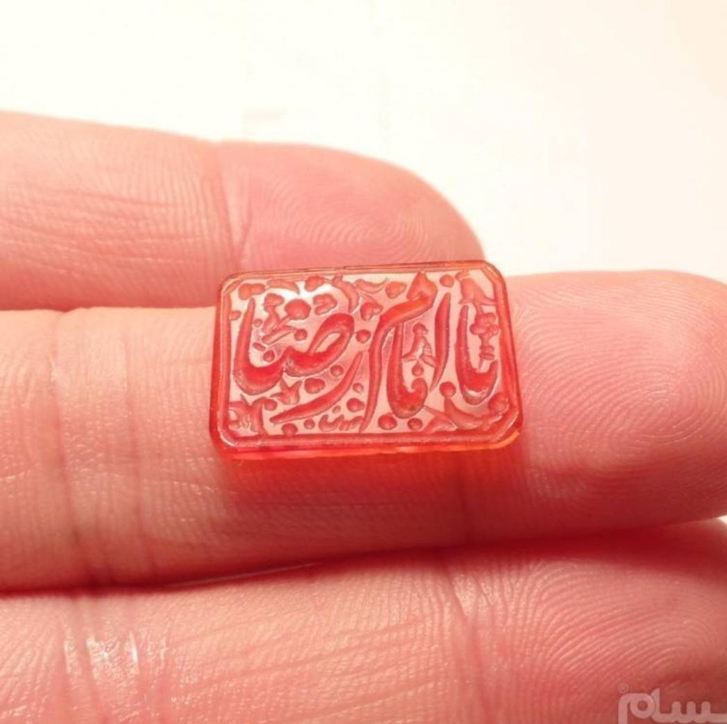 یک قطعه عقیق پرتقالی خوش رنگ و خوش طبع با طبع شیشه ای و عالی با تراش مستطیلی رو و زیر نسبتا تخت که بر روی آن با خط عمیق و به سبک نستعلیق ذکر :(یا امام رضا) حکاکیو اطرافش تذهیب کاری گردیده است امضا و توقیع حکاک پایین خط ( م زرین ) مشهود است