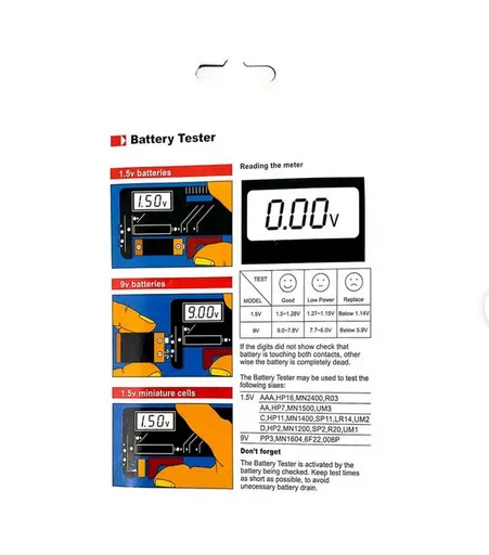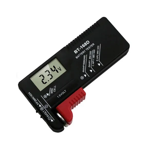 تستر باتری دیجیتال مدل BT-168D وسیله ای بسیار کارآمد و مفید و ضروری برای بررسی و نمایش وضعیت انواع باتری های قلمی و بزرگ و کوچک شارژی و یکبارمصرف است که میتواند براحتی میزان برق موجود در باتری های مختلف قلمی و نیم قلمی ، کتابی 9 ولت و باتریهای ساعتی در مدلهای مختلف خشک و نیکلی و شارژی را بصورت اعداد دیجیتالی نمایش دهد.