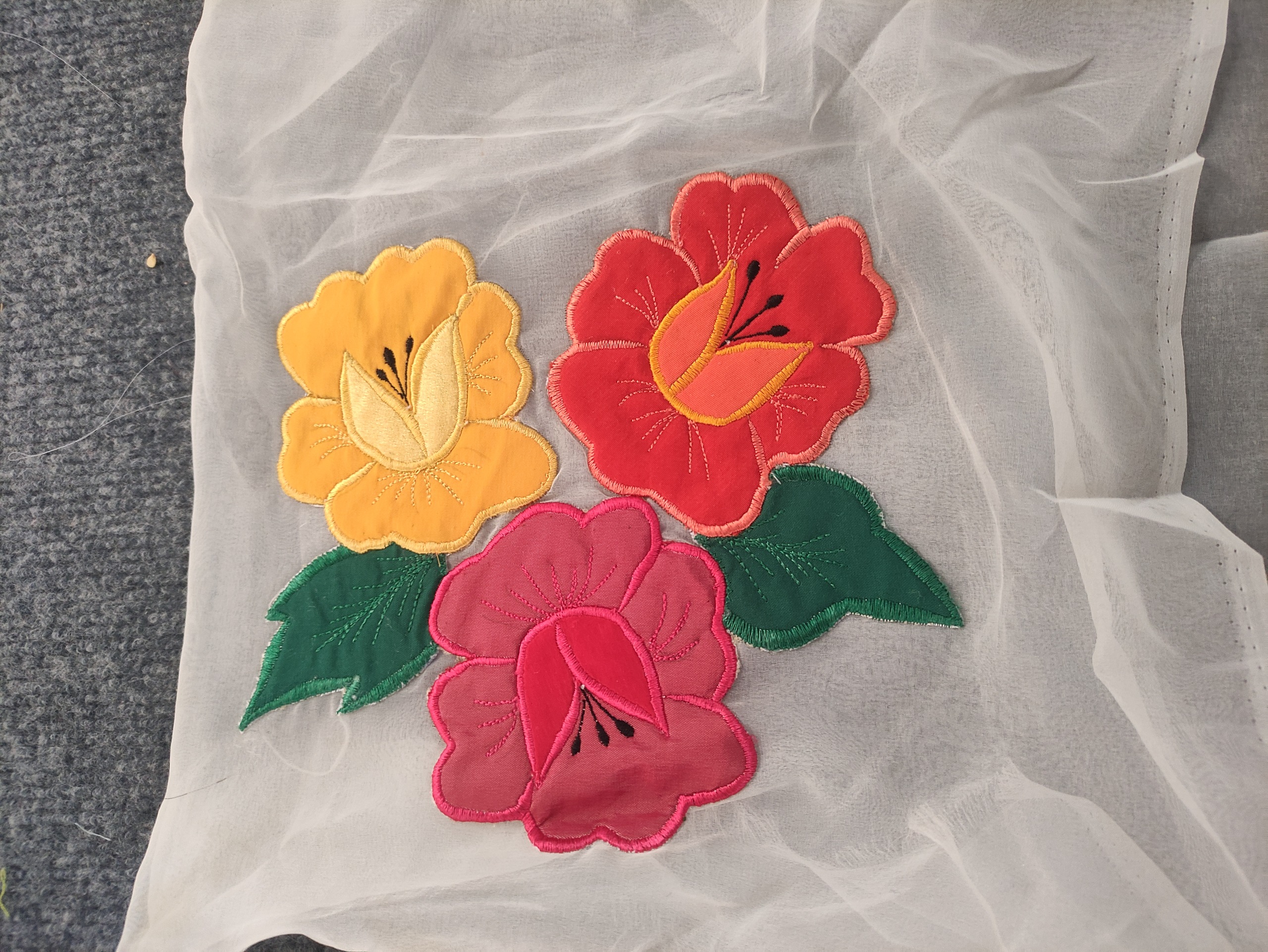 یک قطعه کار تکه دوزی گلدوزی روی تور هست یک پارچه کتان دایره برای انتقال کار روی این دایره و یک قطعه خزی که شکل جیله برش زدن کل سه کار 299 مال دهه 60 هست واقعا زیبا داخل چمدان بودن