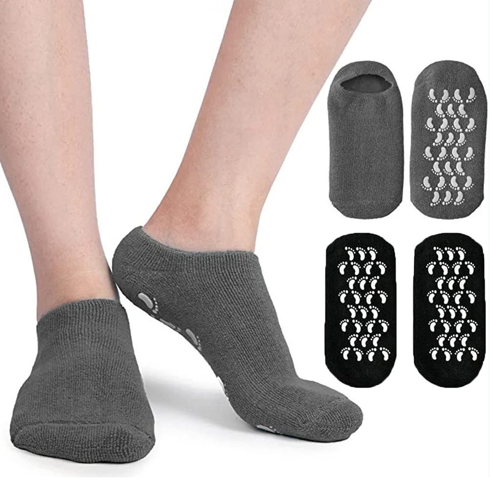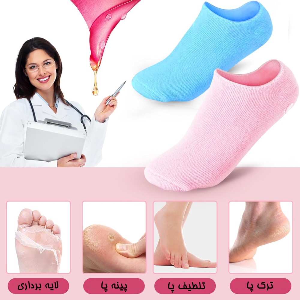 جوراب ژله ای مخصوص ترک پا ، یک جوراب ساق کوتاه است که جنس لایه بیرونی آن نخی می باشد ، بنابراین به سادگی بر روی سطح سر نمی خورد و می توان در حین استفاده از جوراب کمی راه رفت ، بدون اینکه پا به صورت مستقیم با سطح دیگری برخورد داشته باشد . برای ایمنی بیشتر ، زایده هایی به شکل کف پا در قسمت زیرین جوراب ایجاد شده تا علاوه بر کاستن از احتمال سر خوردن ، زیبایی ظاهری آن را افزون نماید . لایه داخلی جوراب سیلیکونی است ، بنابراین به صورت کامل پا را پوشش داده و مانع از نفوذ مرطوب کننده های استفاده شده برای پا به بیرون از جوراب می شود ، بنابراین به راحتی می توانید از کرم ، لوسیون و موادی از این قبیل برای بهبود ترک و خشکی های پا استفاده نمایید . جوراب ژله ای مخصوص ترک پا ارائه شده در رنگ های مختلف مناسب برای بانوان با سایز پا حداکثر 40 می باشد .