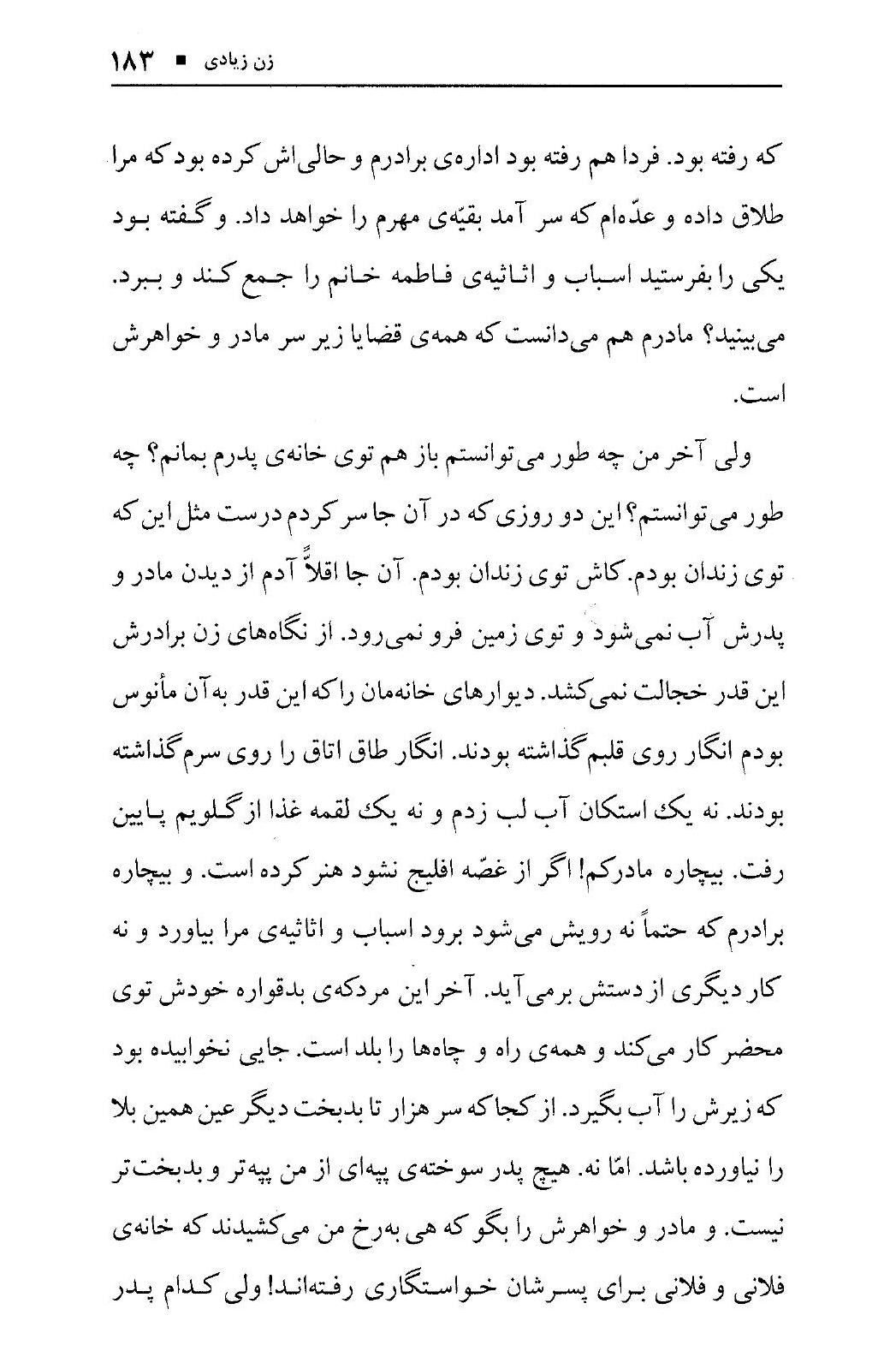 «ننه جون شما هیچ کدوم یادتون نمیآدش. منو تازه دو سه سال بود به خونه شوور فرستاده بودن. حاج اصغرمو تازه از شیر گرفته بودم و رقیه رو آبستن بودم...» خاله این طور شروع کرد. یکی از شبهای ماه رمضون بود که او به منزل ما آمده بود و پس از افطار، معصومه سلطان، قلیان کدویی گردویی گردن دراز ما را - که شبهای روضه، توی مجلس بسیار تماشایی است - برای او آتش کرده بود ؛ و او در حالی که نی قلیان را زیر لب داشت، این گونه ادامه میداد: «... تو همین کوچه سیدولی - که اون وقتا لوح قبرش پیدا شده بود و من خودم با بیم رفتیم تموشا، قربونش برم! - رو یه سنگ مرمر یه زری، ده پونزده خط عربی نوشته بودن. اما من هرچه کردم نتونستم بخونمش. آخه اون وقتا که هنوز چشام کم سو نشده بود، قرآنو بهتر از بی بیم می خوندم. اما خط اون لوح رو نتونستم بخونم. آخه ننه زیر و زبر که نداش که... آره اینو میگفتم. تو همون کوچه، یه کارامسرایی بودش خیلی خرابه، مال یه پیرمردکی بود که هی خدا خدا میکرد، یه بنده خدایی پیدا بشه و اونو ازش بخره و راحتش کنه...» خاله پس از آن که یک پک طولانی به قلیان زد و معلوم بود که از نفس دادن قلیان خیلی راضی است، و پس از اینکه نفس خود را تازه کرد، گفت: «... اون وقتا تو محل ما یه دختر ترشیدهای بود، بهش بتول می گفتن. راستش ما آخر نفهمیدیم از کجا پیداش شده بود. من خوب یادمه روزای عید فطر که میشد، با ییشای صناری که از این ور و اون ور جمع میکرد، متقالی، چیتی، چیزی تهیه میکرد و میومد تو مسجد «کوچه دردار» و وقتی نماز تموم میشد، پیرهن مراد بخیه میزد. ولی هیچ فایده نداشت. بی چاره بختش کور کور بود. خودش میگفت: «نمی دونم، خدا عالمه! شاید برام جنبلی، چیزی کرده باشن. من کاری از دستم بر نمیآدش. خدا خودش جزاشونو بده.»