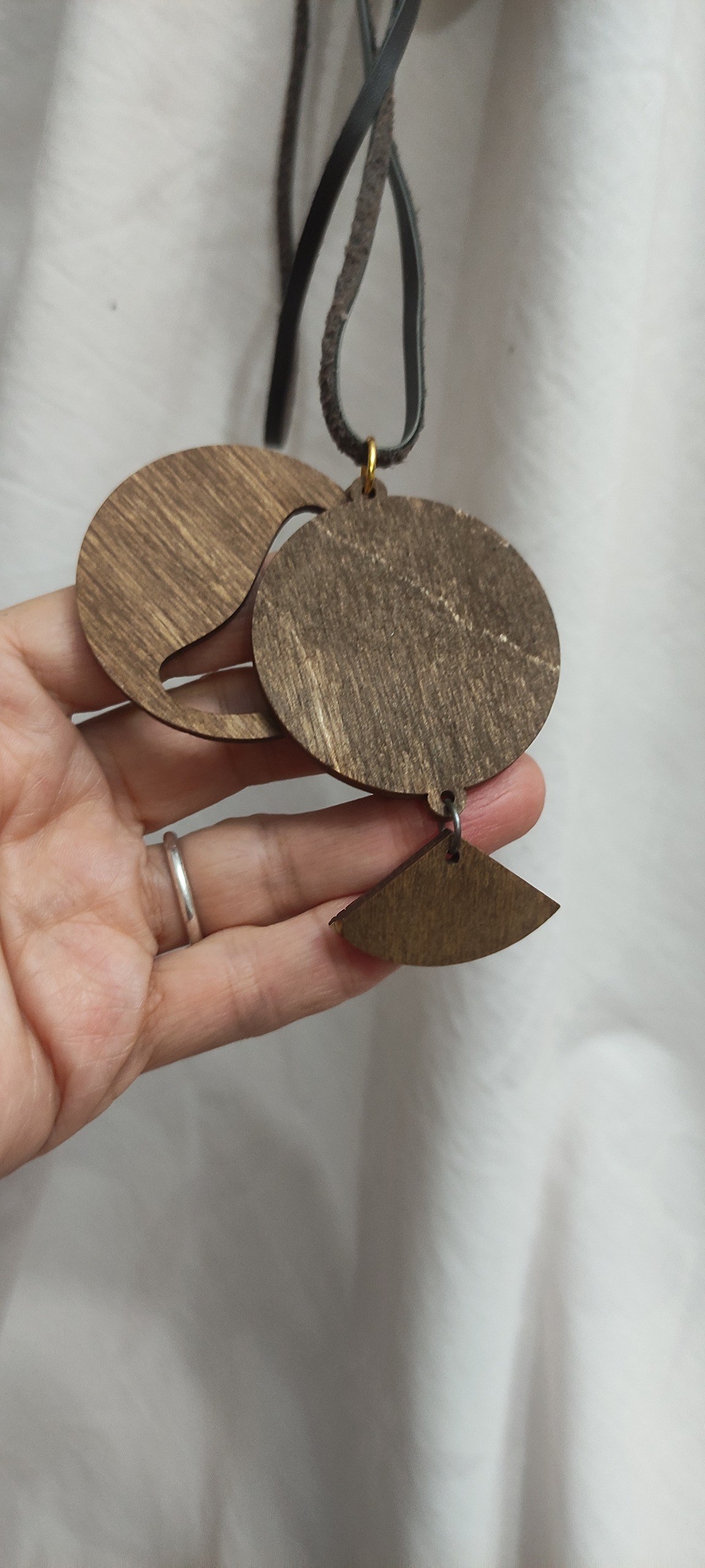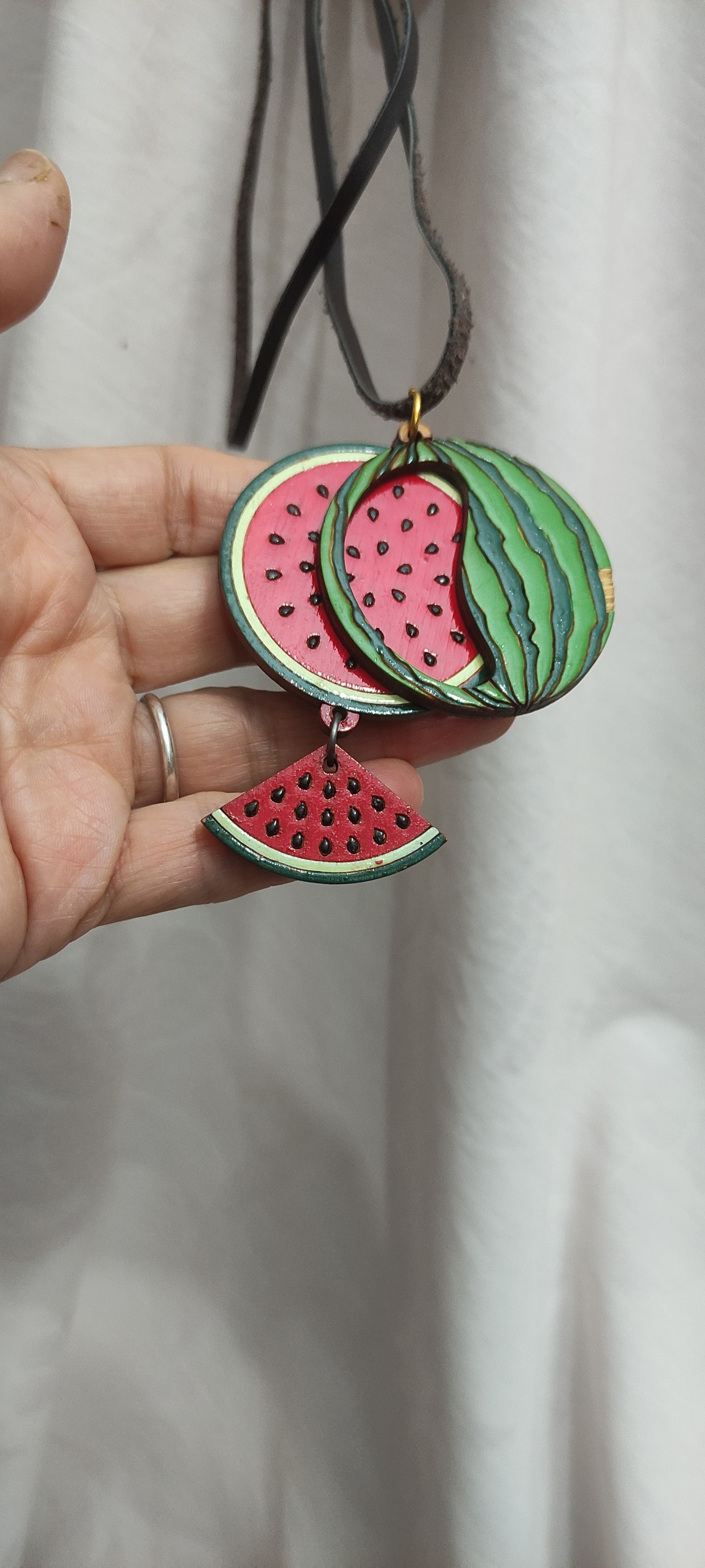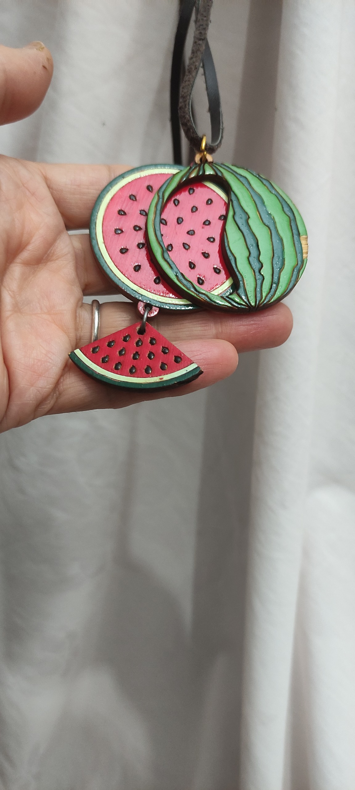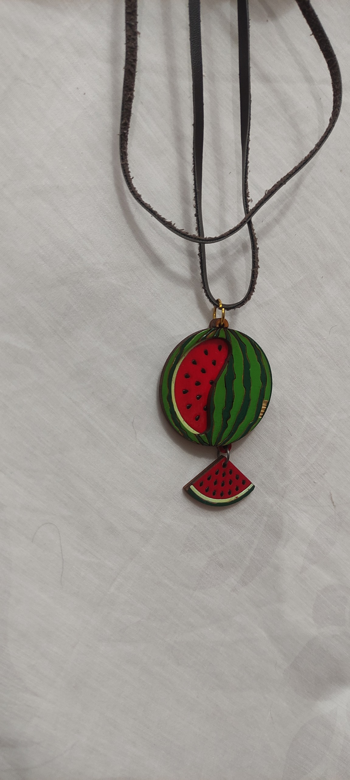 گردنبند یلدایی هندوانه،صنایع دستی،جنس چوبی با بند چرمی،سه تا قطعه هست که دوتاش روی هم قرار میگیرند،پوست هندوانه یک پریدگی داره که ماژیک یا لاک میشه کاورش کرد